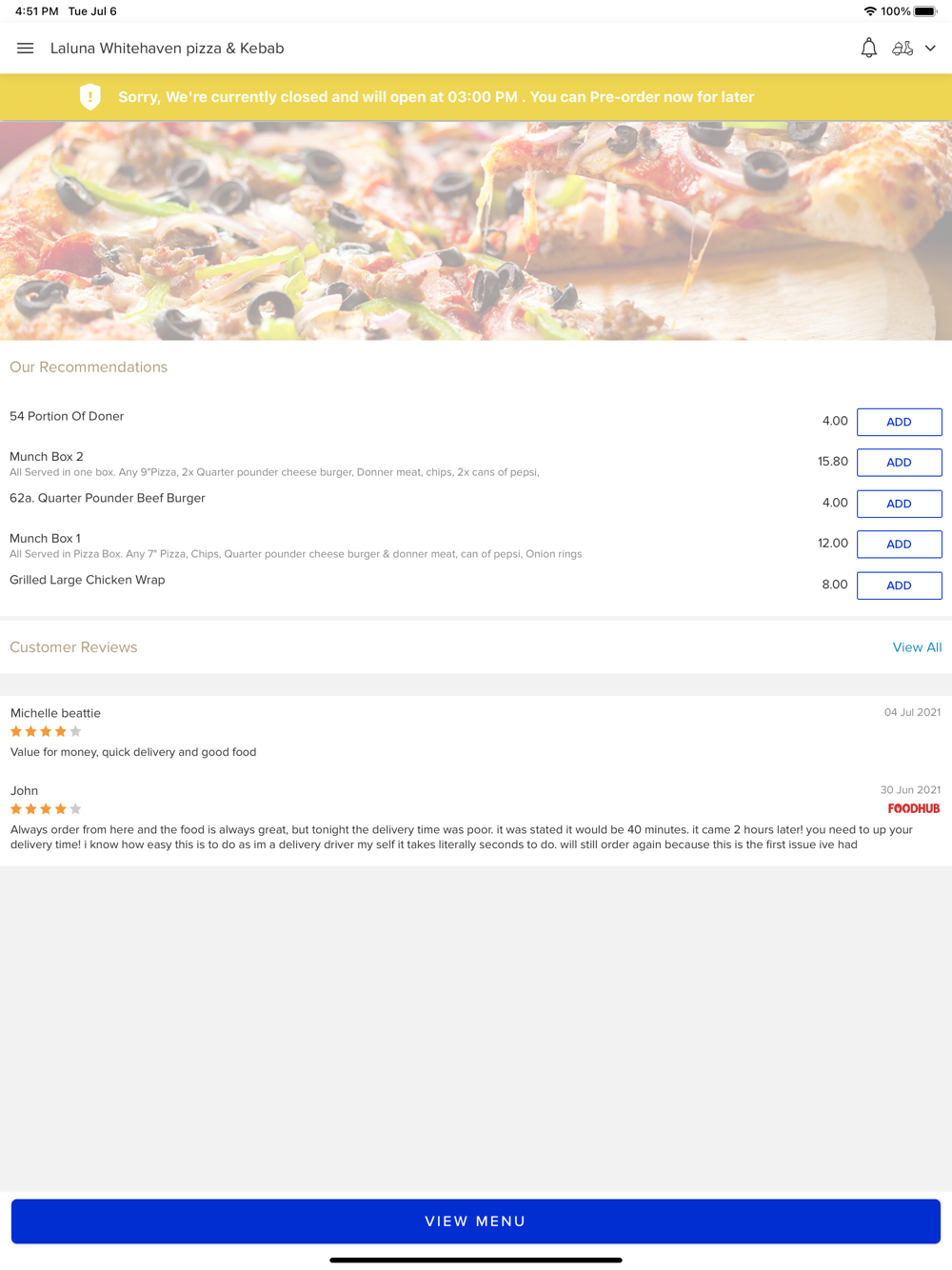 As a result, we are finally proud to unveil and introduce our latest improvement, our new online ordering app! You can now relax at home and order your favourite, freshly prepared meals from Laluna Whitehaven pizza & Kebab, online. You can even pay online! Laluna Whitehaven pizza & Kebab in Whitehaven will always be offering great food at affordable prices. Please feel free to browse our new app and place your order online. Remember to check our new online ordering site to get up to date prices and exclusive special offers, limited to our online customers only!