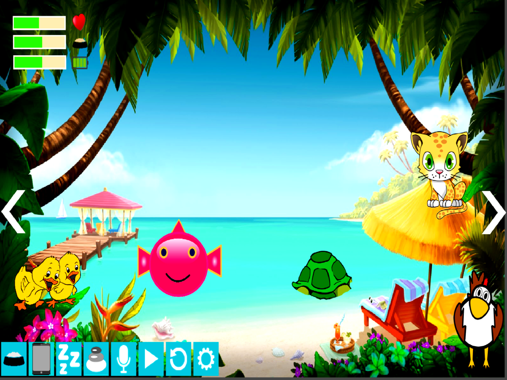 Are you ready to take care of your new best friend in Virtual Pet Talking Animals? Install the game now and start having fun! The aim of the Virtual Pet - Animal Sounds game is to feed your fish, put it to sleep and play with it, and play animal sounds. The app is designed for children and babies. Talk with the fish by pressing the microphone button. The app records your voice and the fish repeats what you say. You can apply pitch sound effects and change the voice pitch using the settings button. The fish is living in a lake in a forest. It has animal friends, a rooster, dog, cat, sheep, donkey, duck, chick, turtle, and a baby. The fish becomes happy when it hears the sounds of other animals and the baby. The fish would like to play with a tablet and listen to music and lullaby. The fish becomes afraid when you throw a stone into the lake. Turtle hides and unhide when you touch it and makes a squeaking sound. The game aims to make the fish happy, full, and full of energy. You'll receive a happy birthday cake and a happy birthday song once the fish is fully fed, full of energy, and happy!