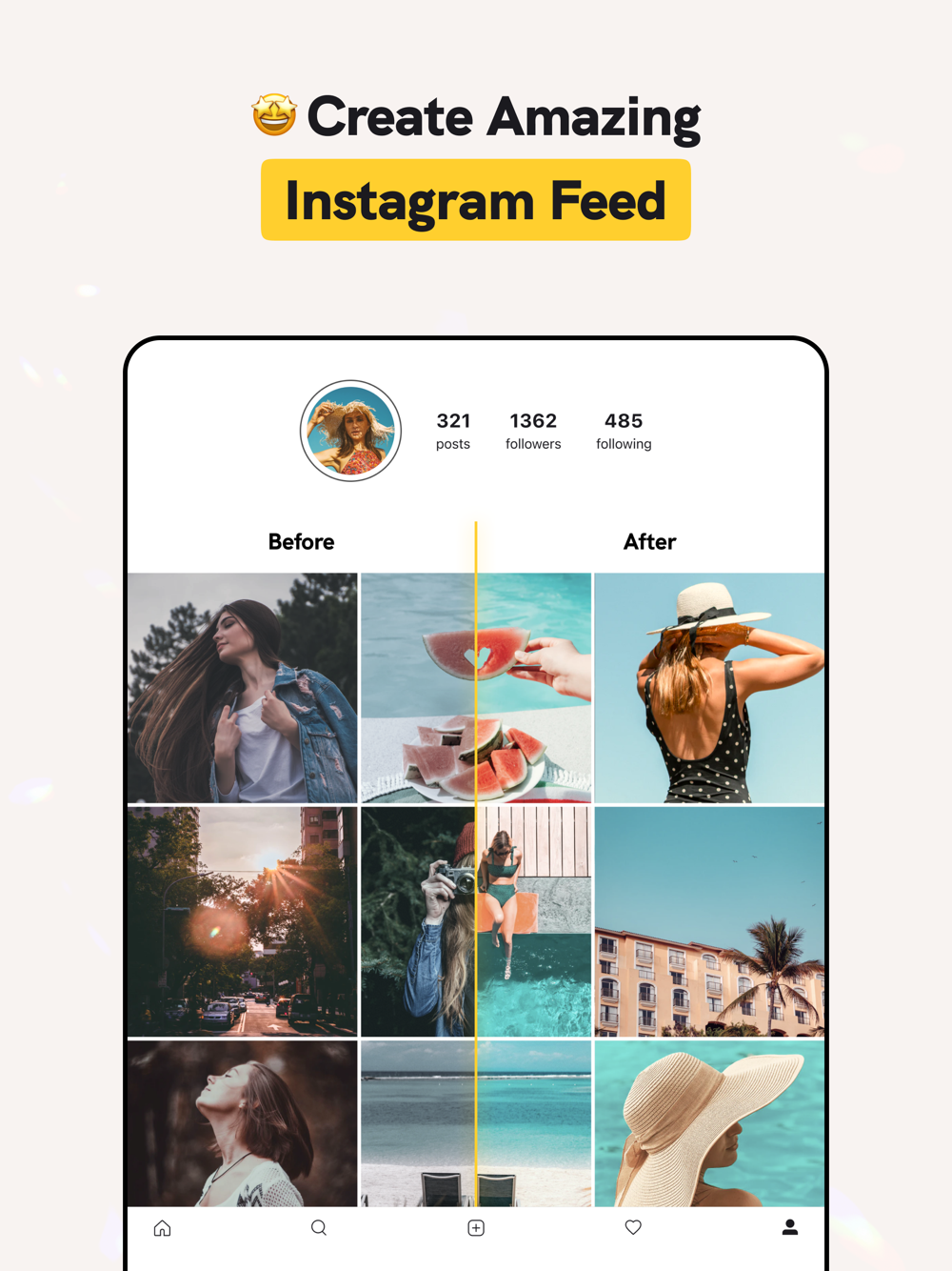 Create your own unique theme and layout and see how your feed will look like before you post. Upload your existing feed and add photos from your camera roll to check how good they look together. Drag and drop individual tiles if you feel that anything is out of place until you achieve a perfect look you have in mind. With this visual planner it is easy to design a catchy feed and have all your future posts neatly organized.
