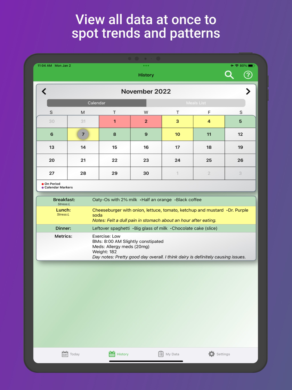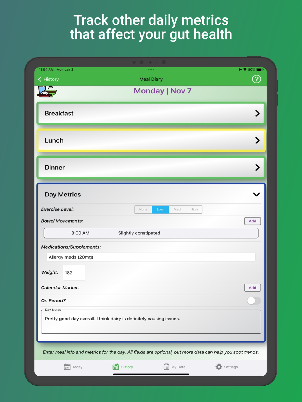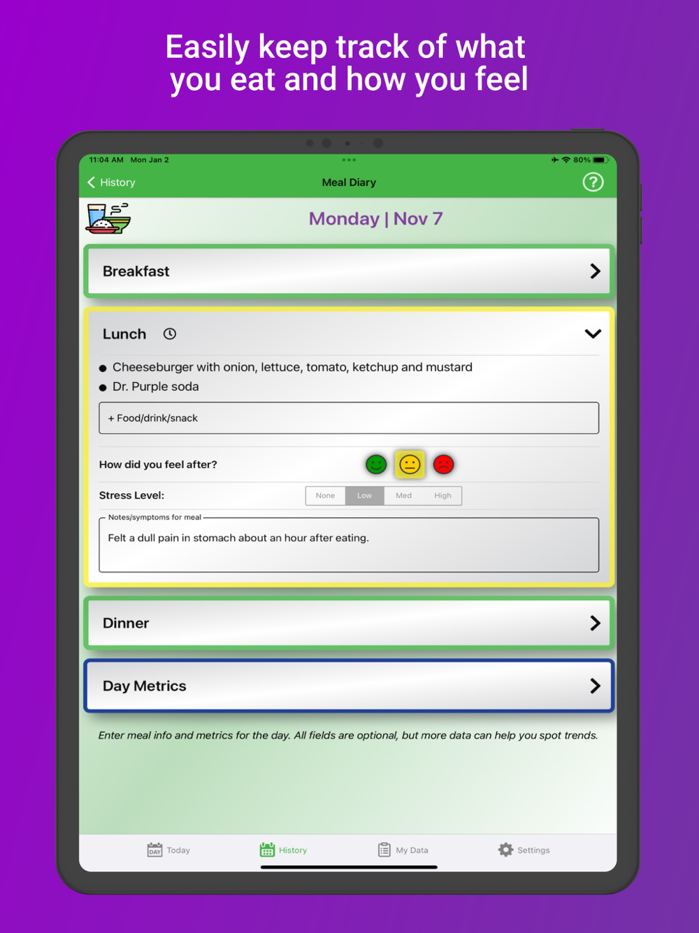 Tummy Tamer helps you better understand digestive issues. Easily track your food and drink intake, along with other metrics that affect your gut like stress, exercise, medications, BMs, and diet changes. Quickly see how certain meals made you feel with color-coded graphs so you can spot trends and patterns. The path to digestive health starts with good record-keeping, and Tummy Tamer is here to make it simple.
