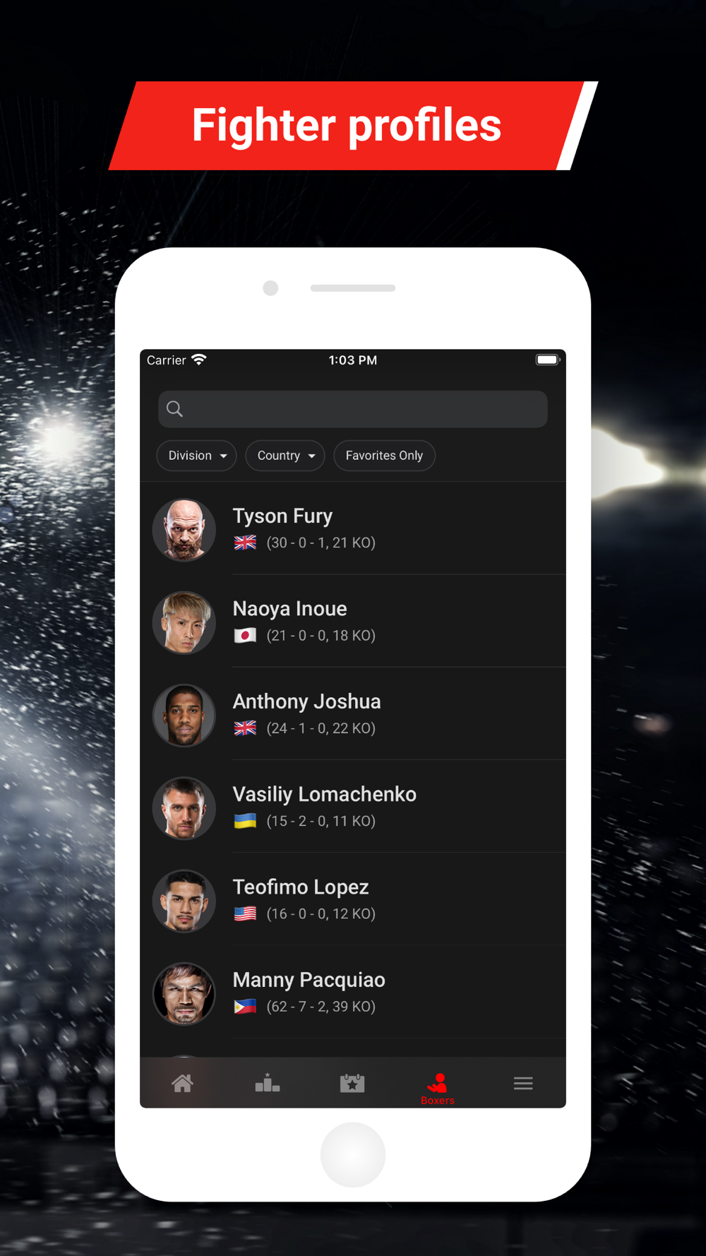 - Add Fighters to Favourites and filter the content based on your interests