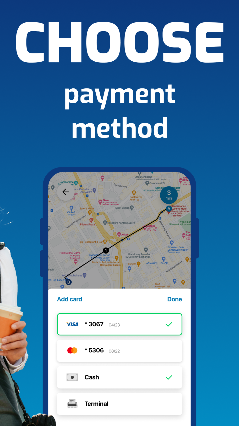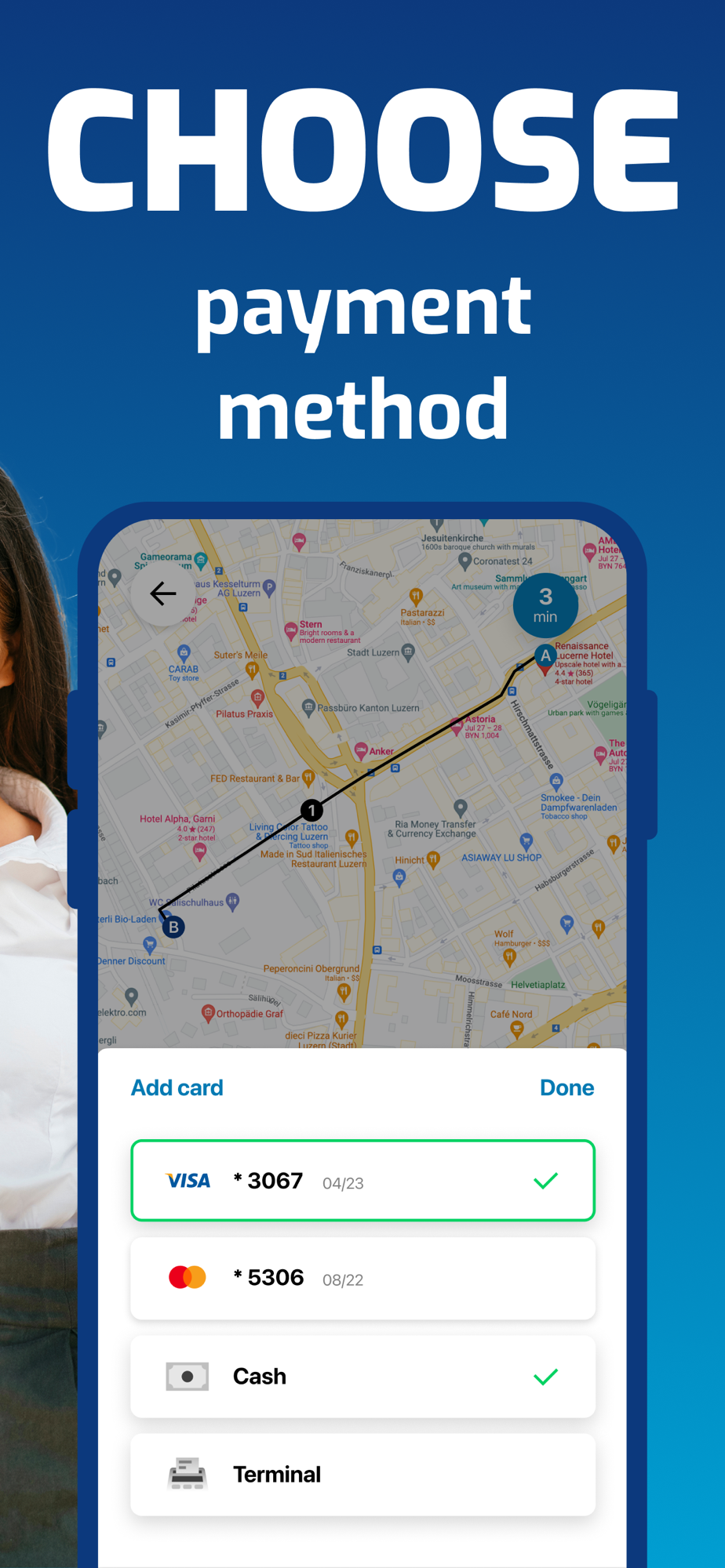 HOP IN hotel taxi allows the nearest driver to arrive at your pick-up location anywhere in Lucerne, Switzerland. There is no need to wait or use public transport. Whether it's a usual taxi ride, private hire or airport transfer, you can always book a ride in a matter of minutes!