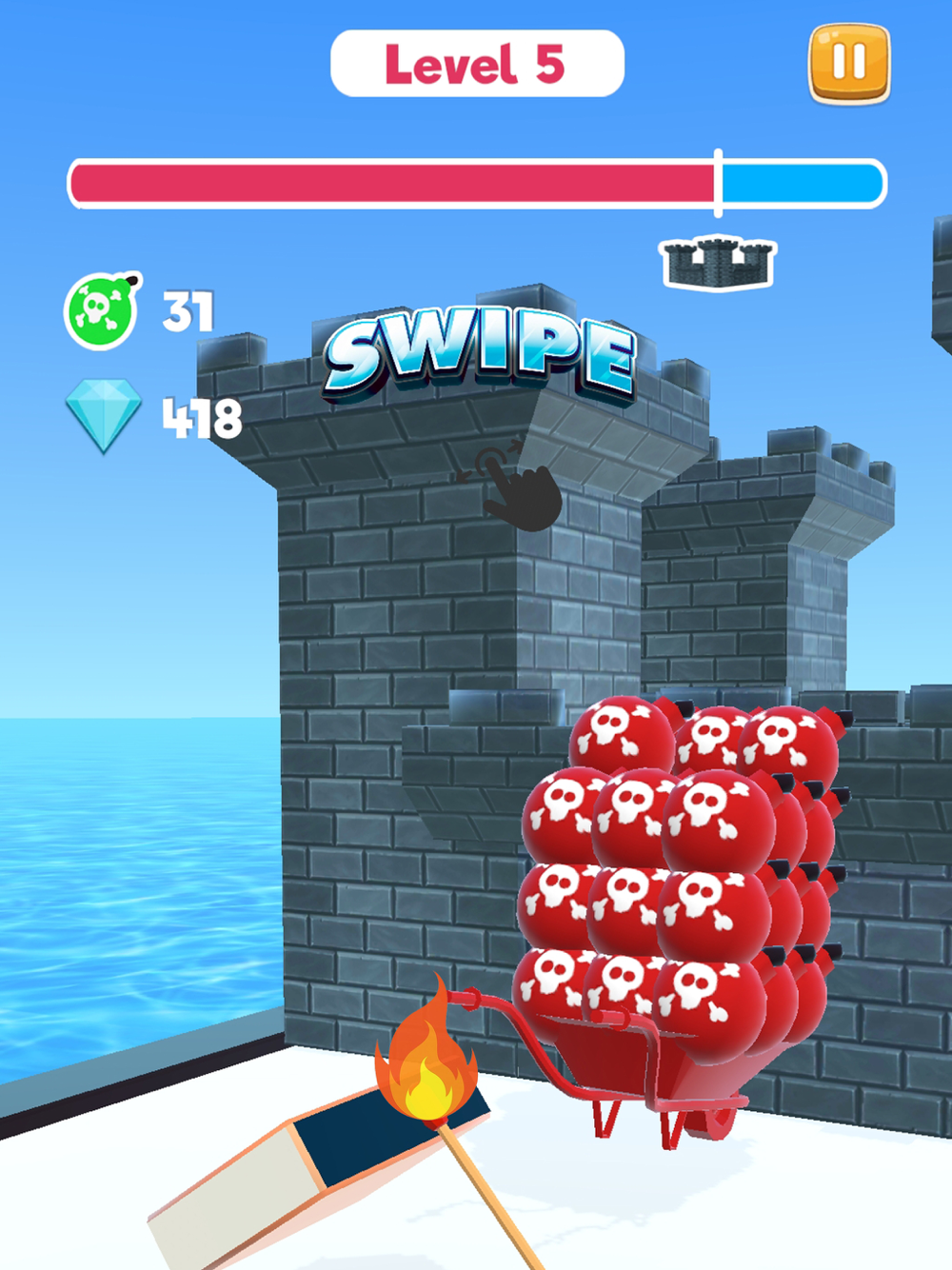 Bomber Rush is a very fun game to play! Collect all correct colored bombs and explode the castle!