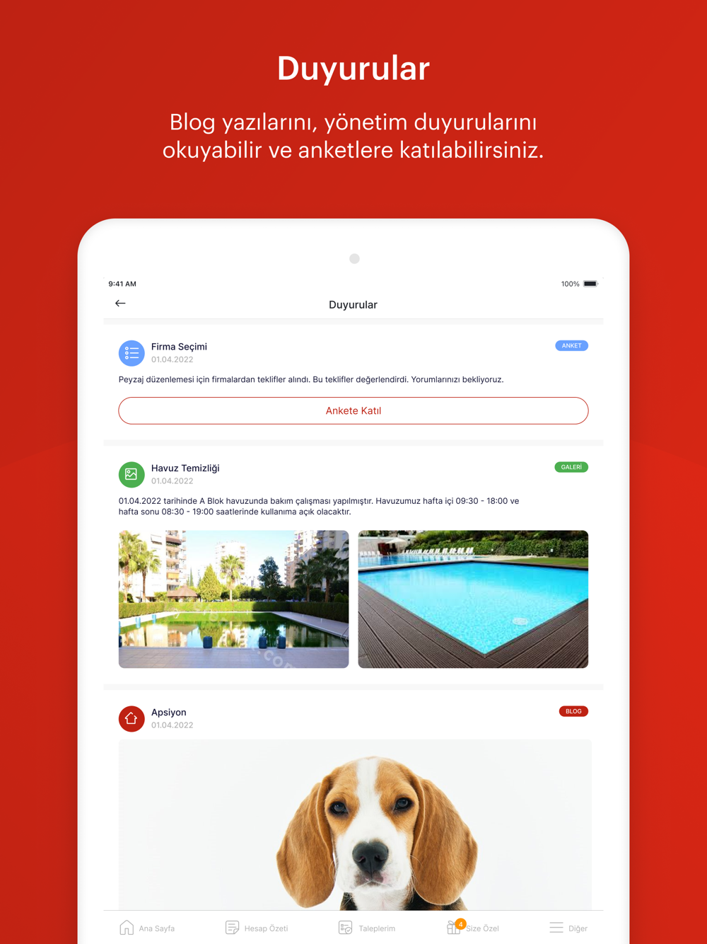 Yönetim duyurularına ve anketlerine ulaşabilir, blog yazılarını okuyabilirsiniz.