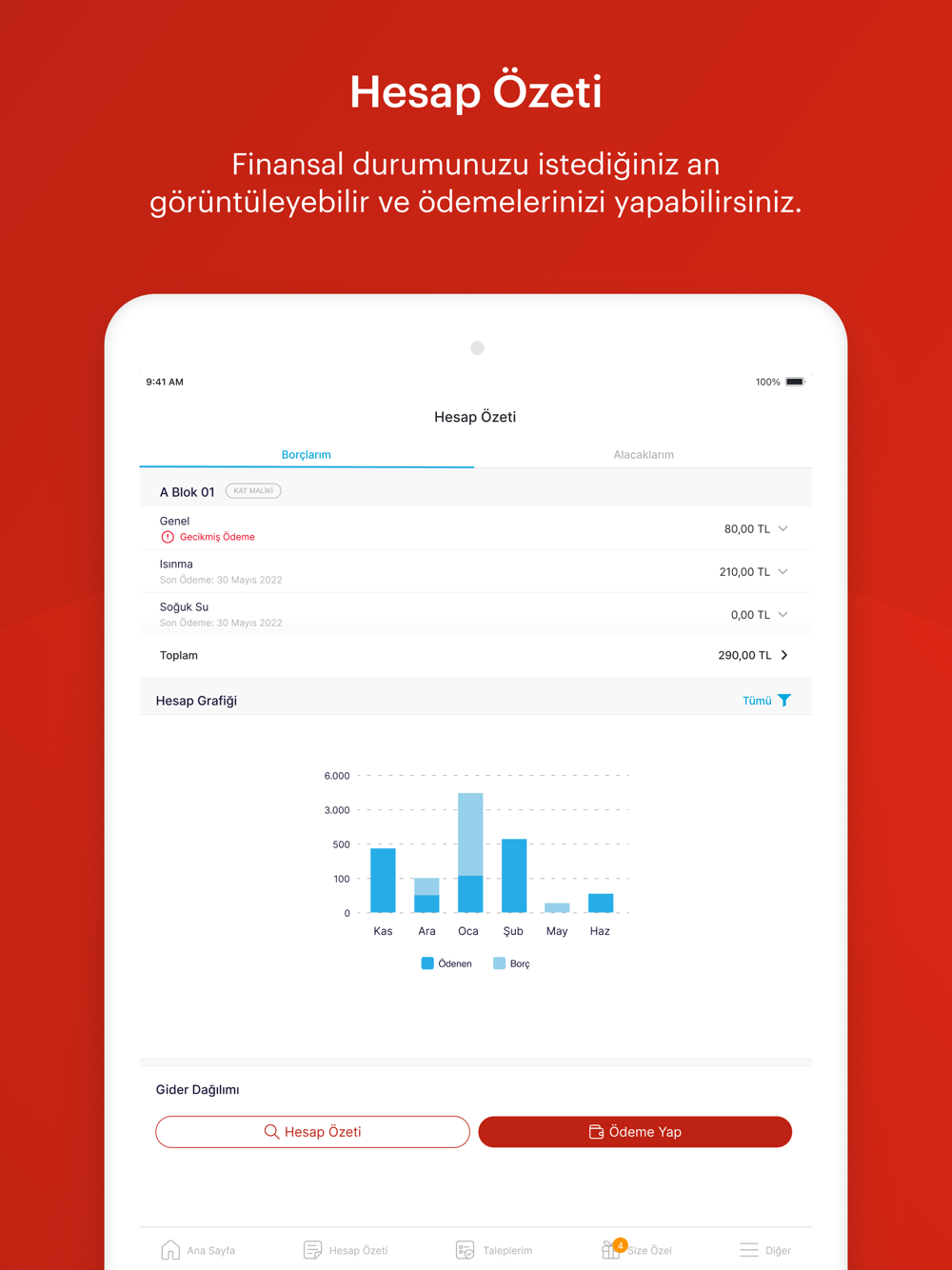 Dairenize ve varsa kiracınıza ait finansal durumu takip edebilirsiniz.