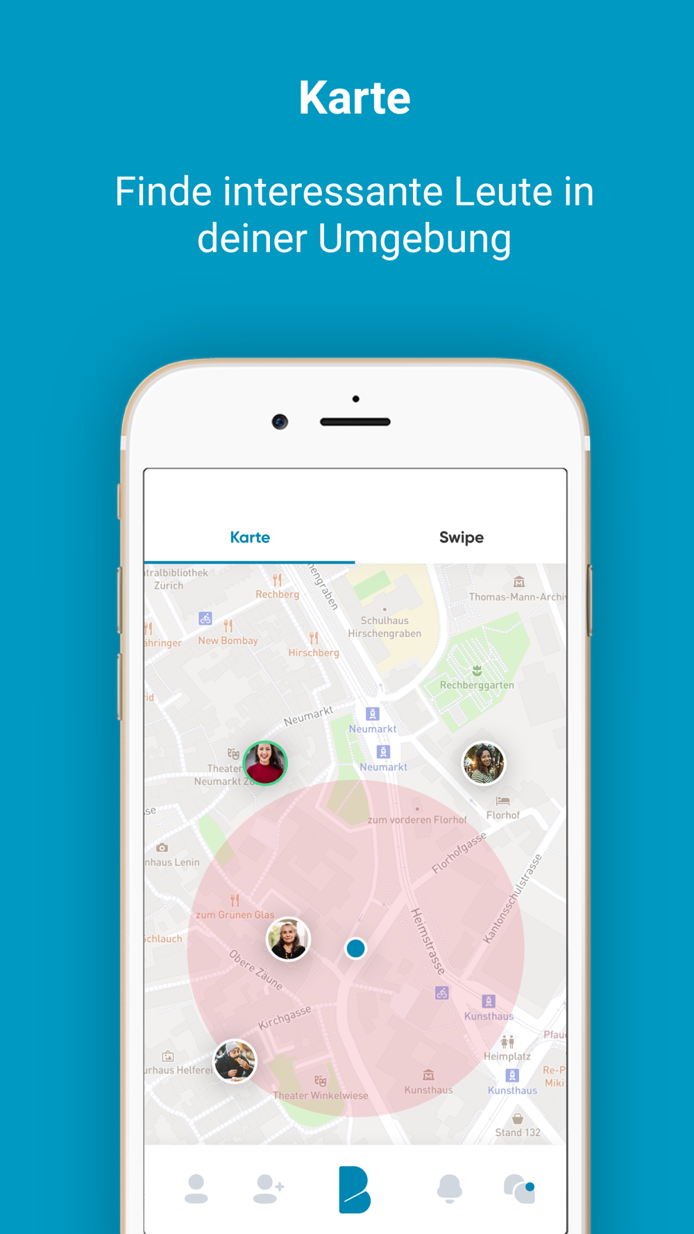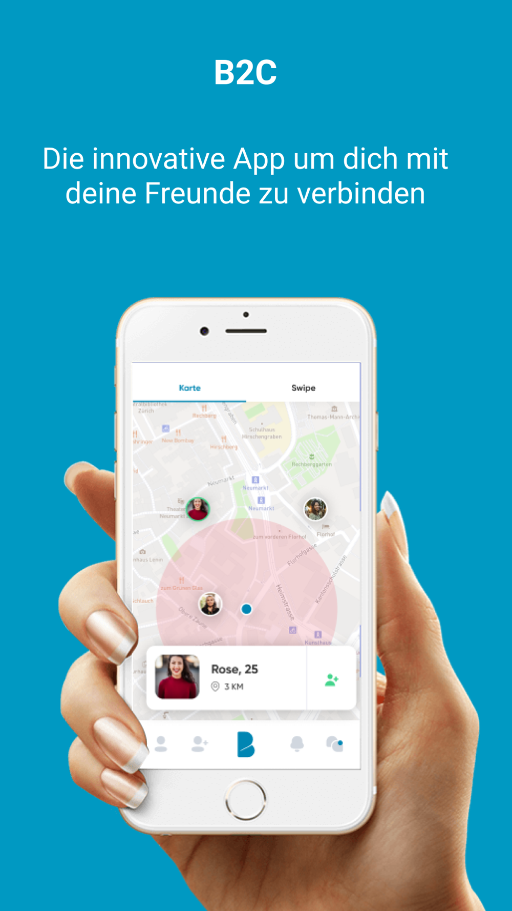 Die B2C App ermöglicht es dem Nutzer, Personen in der Umgebung, welche ebenfalls die B2C App nutzen, zu finden, zu kontaktieren und sich auf anderen sozialen Netzwerken mit ihnen zu verknüpfen.