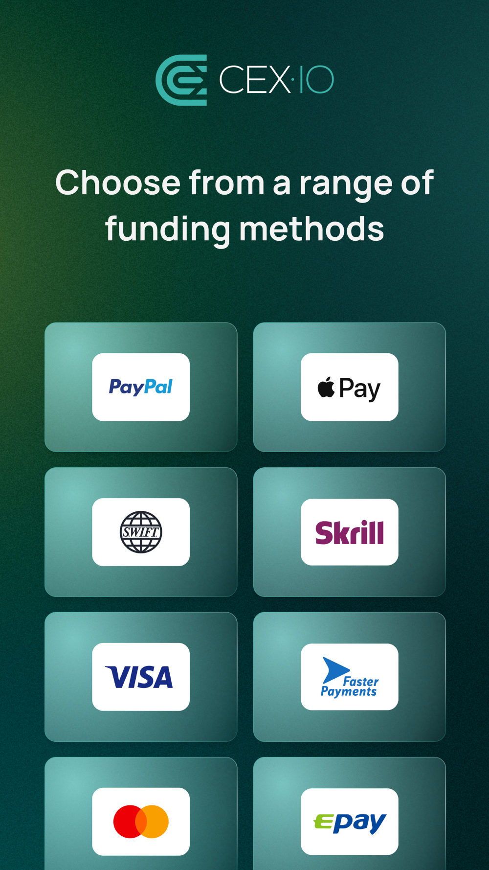 ² The funding and payment methods available to you will differ depending on your country of residence. To learn more, https://cex.io/limits-commissions.