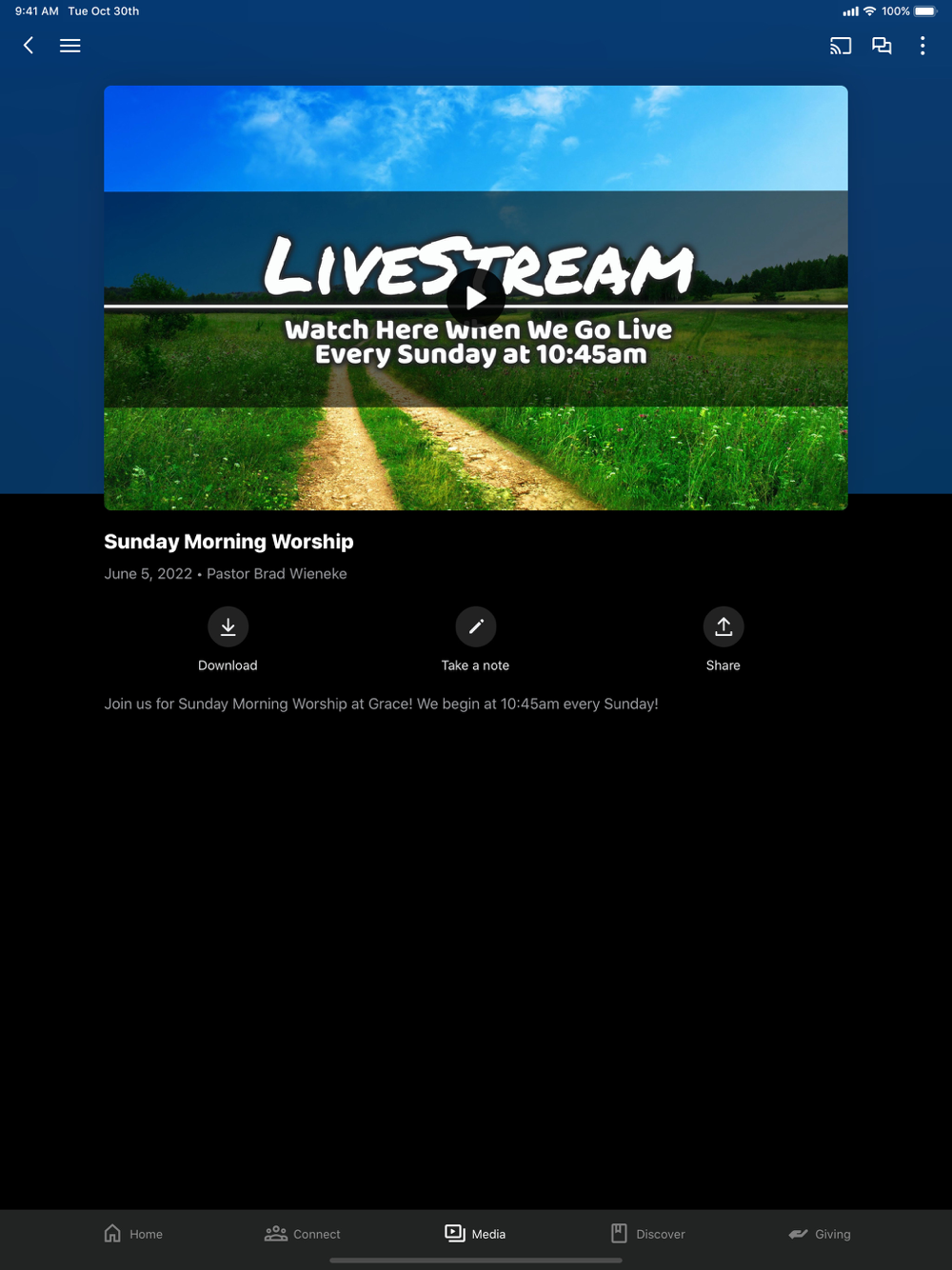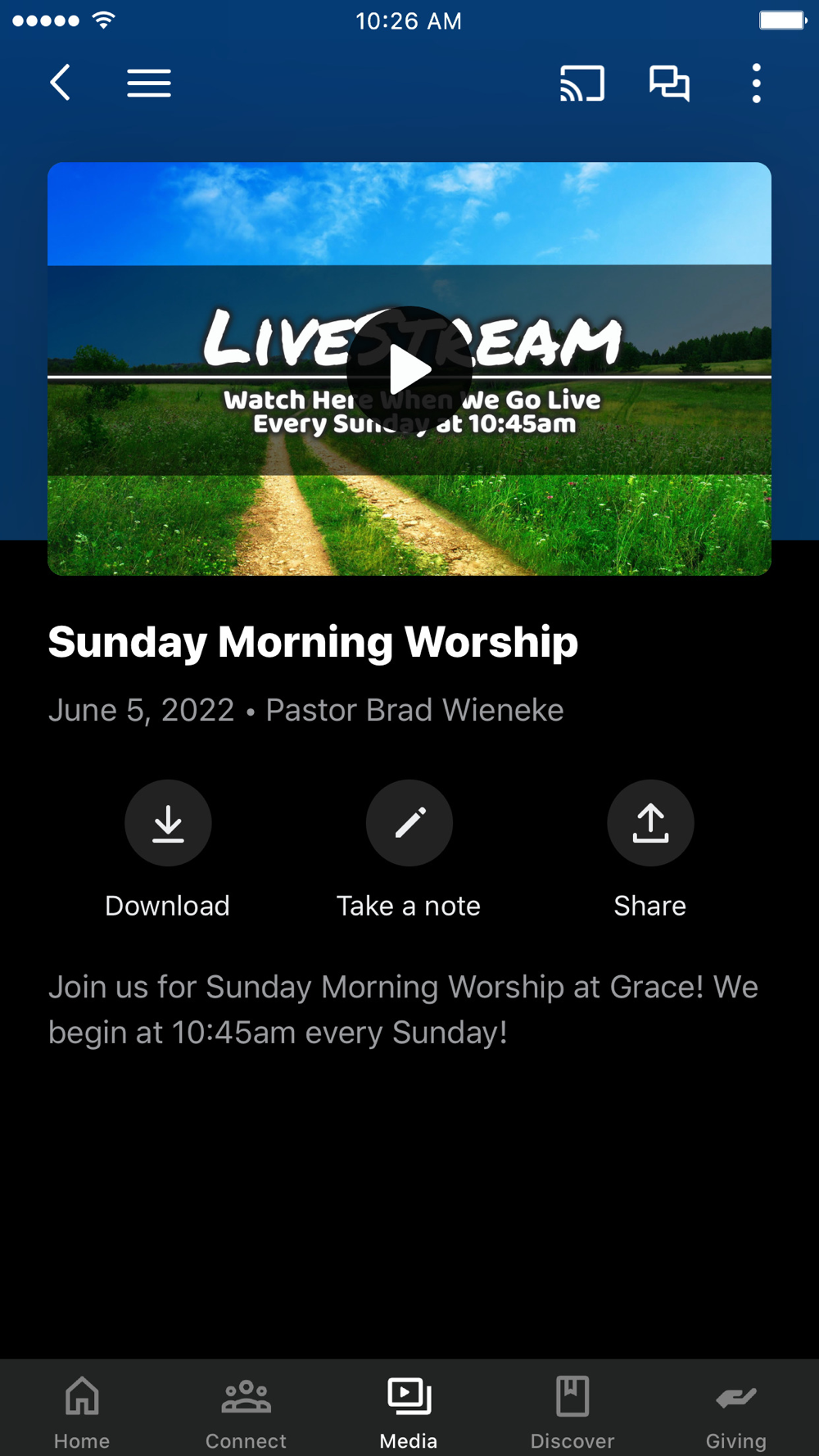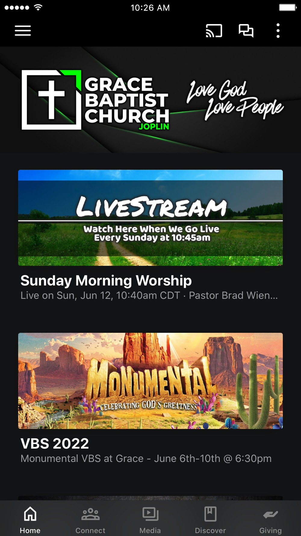 This app will help you stay connected with the day-to-day life of Grace Baptist Church. We know that family and connection are important to each of you. With this app you can: watch or listen to our current Live Messages or any past messages in our On Demand Library; stay up to date with push notifications; share your favorite messages with others; and even chat in groups. Download today and stay connected no matter where you are.