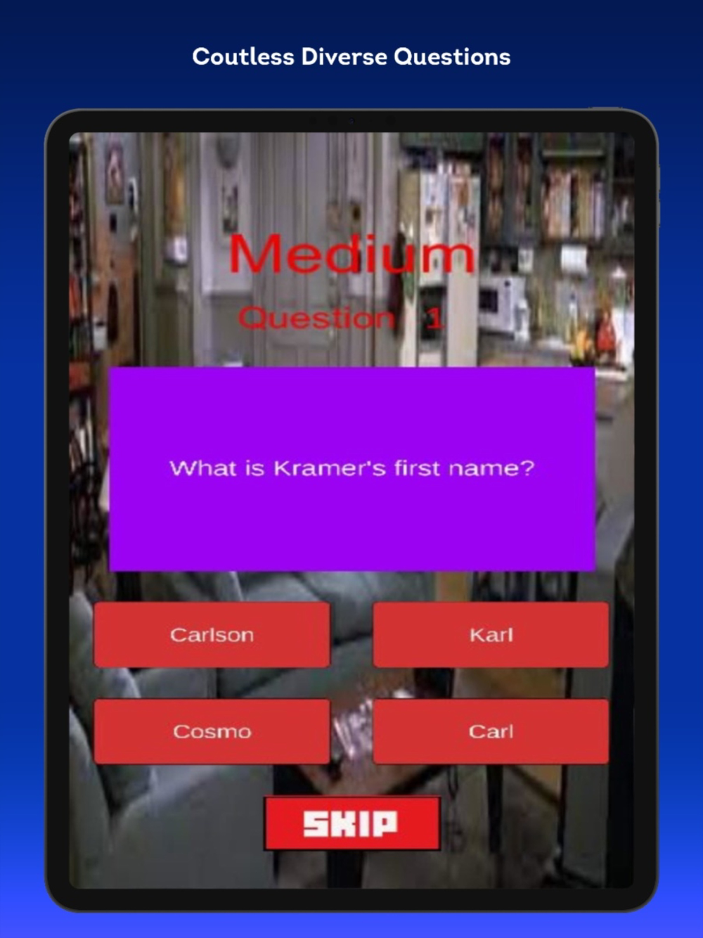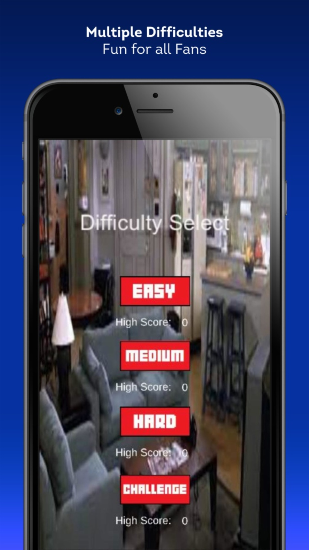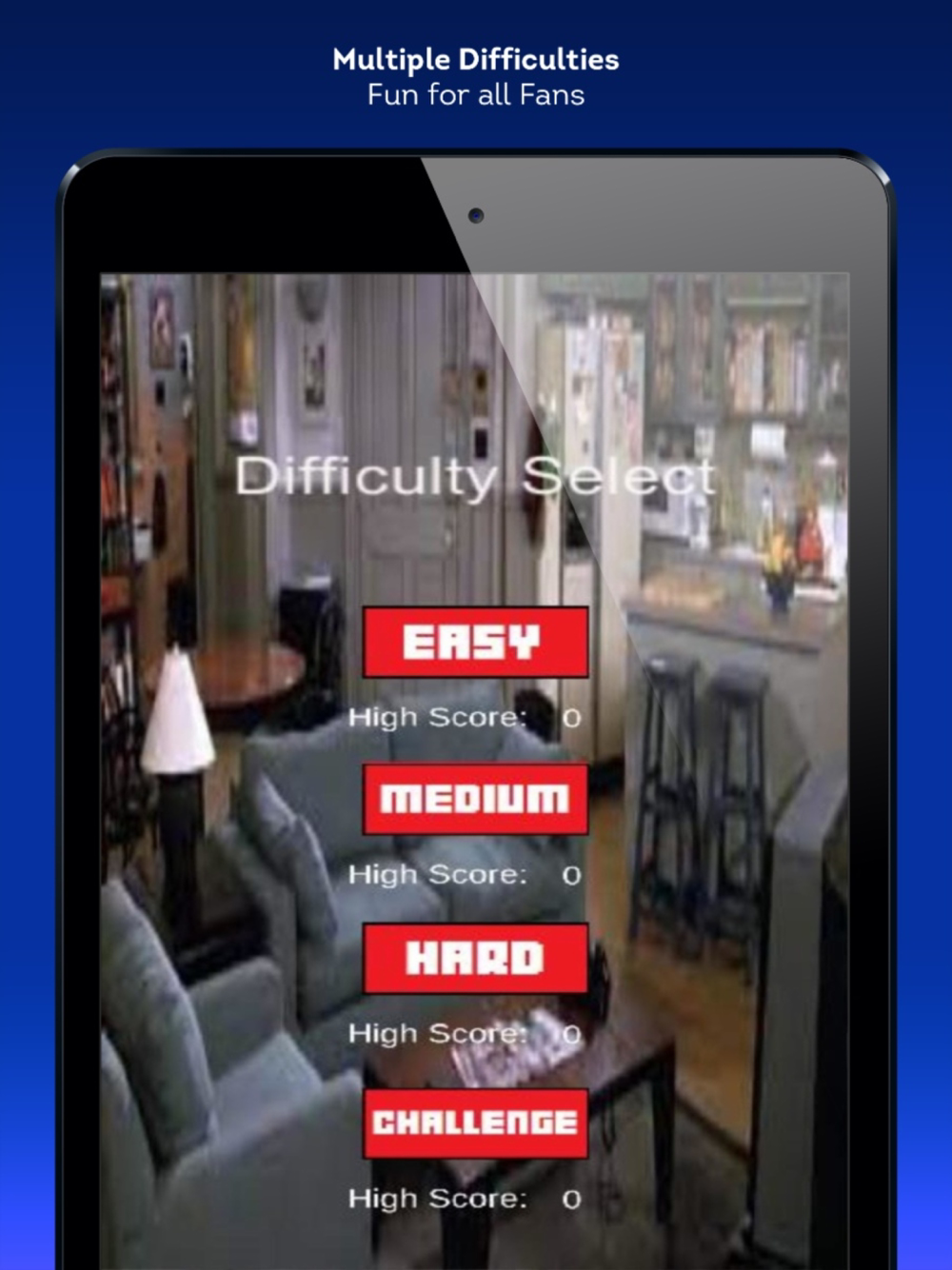 To make the app enjoyable for all players, we added the option to select a difficulty level. Casual fans can test their knowledge on easy, while binge-watchers and die-hard followers can push themselves on medium and hard difficulties. Once all questions of one difficulty are passed, the user is prompted to move on to harder questions.