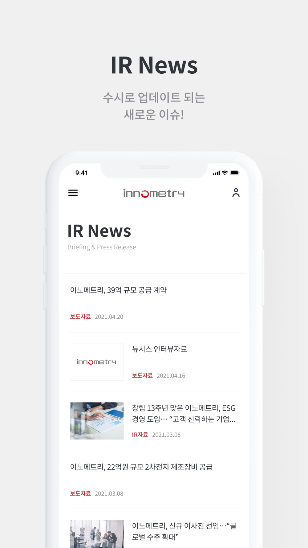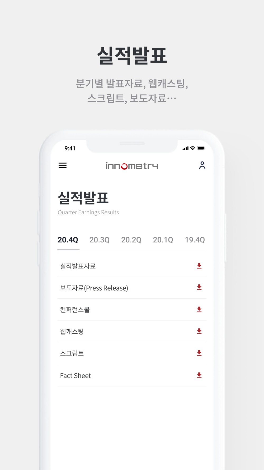 이앱은 이노메트리의 IR정보를 제공하는 Application으로 IR일정, 분기별 실적발표자료, 다양한 IR News, 주요 경영보고서, 재무정보, 공시, IR담당자 Contact 정보 등 최신 IR정보를 제공합니다.
