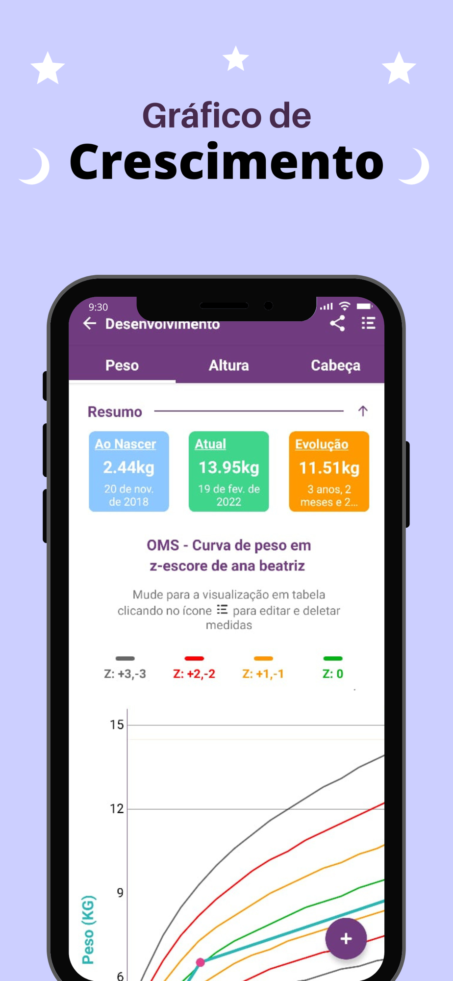 - Curva de crescimento, para você se manter informada quanto a evolução do seu bebê/filho;