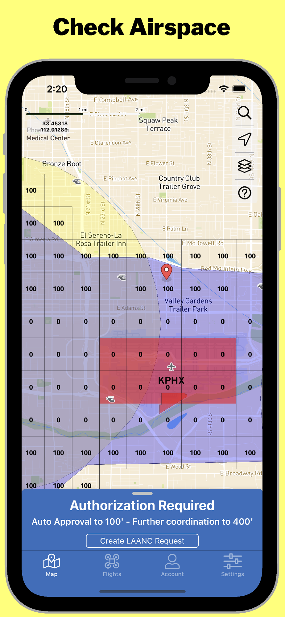 Obtain real-time airspace authorization to operate your drone controlled airspace via the FAA's Low Altitude Authorization and Notification Capability (LAANC) service. Supports recreational and Part 107 operations (day and night).