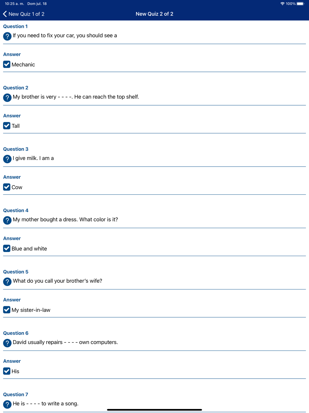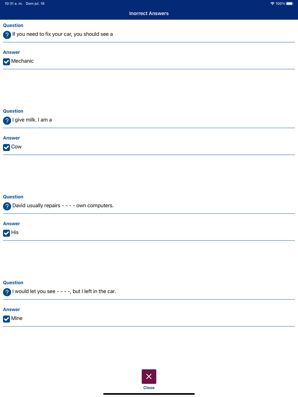 When you finish answering the quiz, you will be shown how many correct and incorrect answers you had, you will also be able to see all the questions its the quiz, see the questions in which you made a mistake along with their correct answer, try again or return to the main menu.