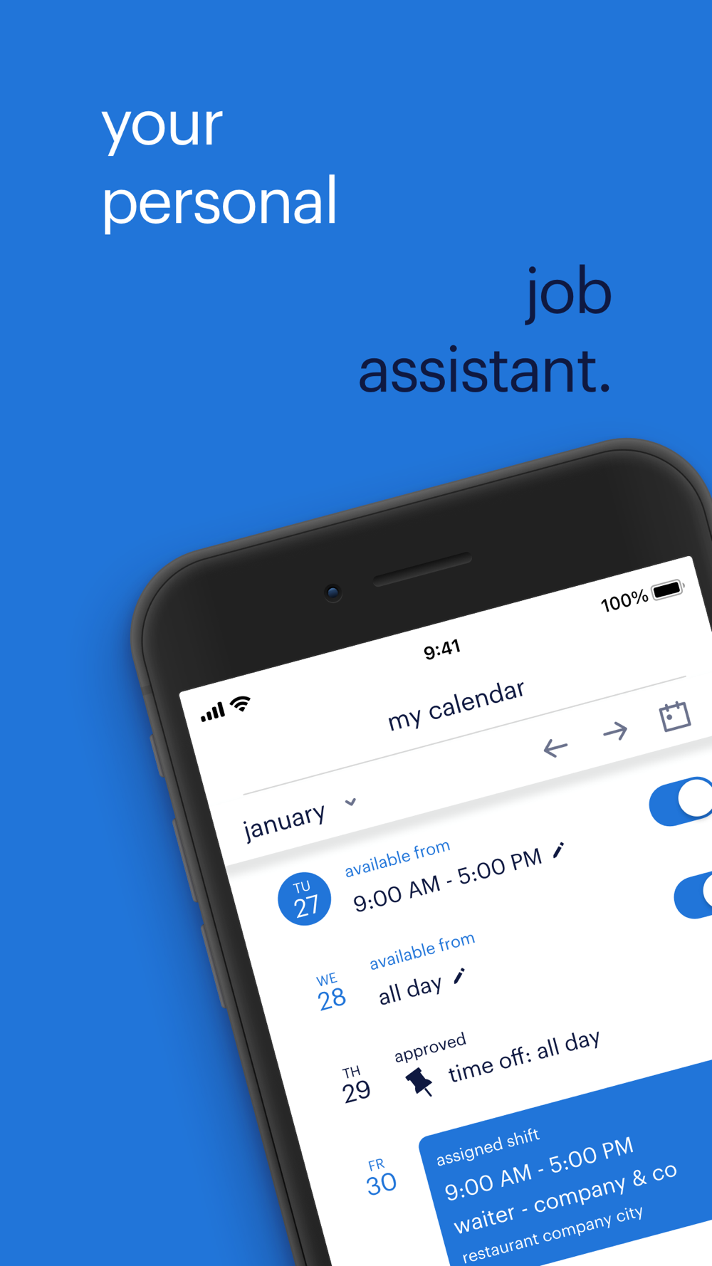 • Easily set and adjust when you are available or unavailable to work (entire days, or part of the day)