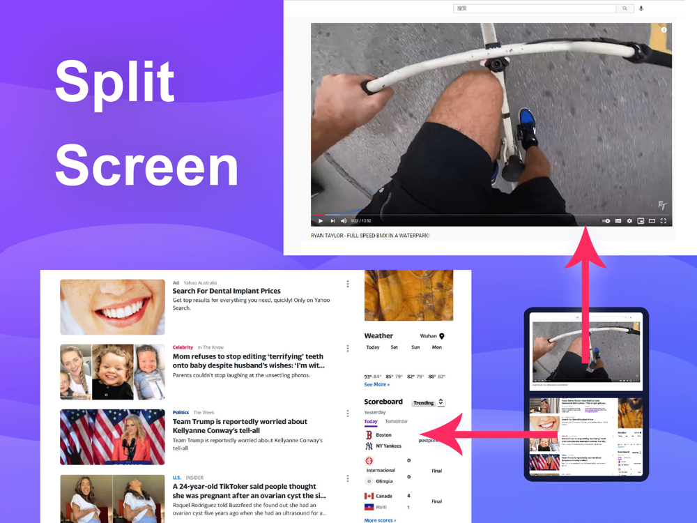 【Split screen browsing】: browse 2 web pages at the same time, for example, play web videos and search online