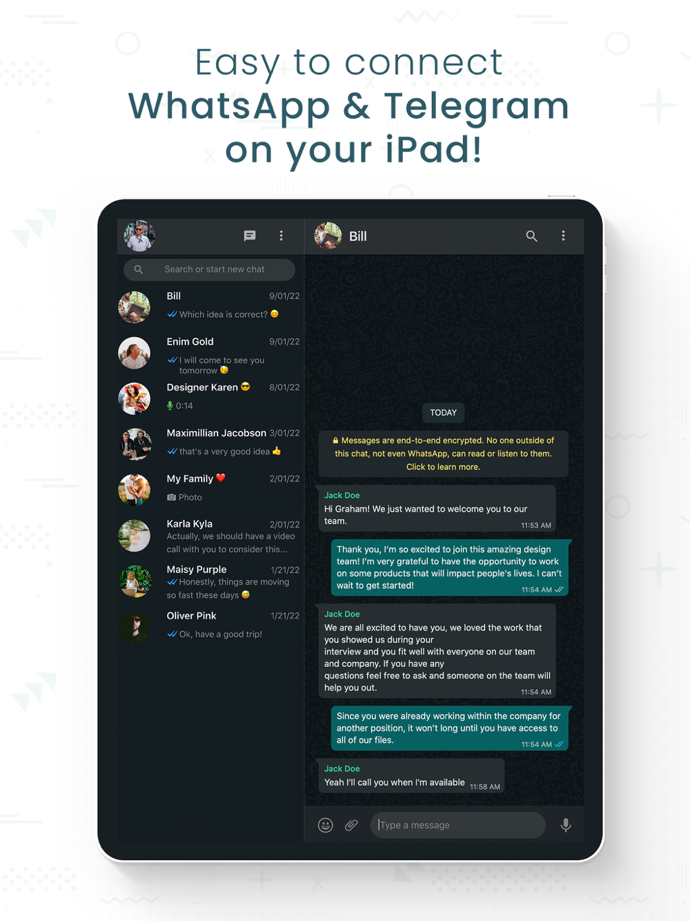 You can view your business or personal messages securely on your iPhone. This app is compatible with WhatsApp Messenger, WhatsApp Business and Telegram Messenger.