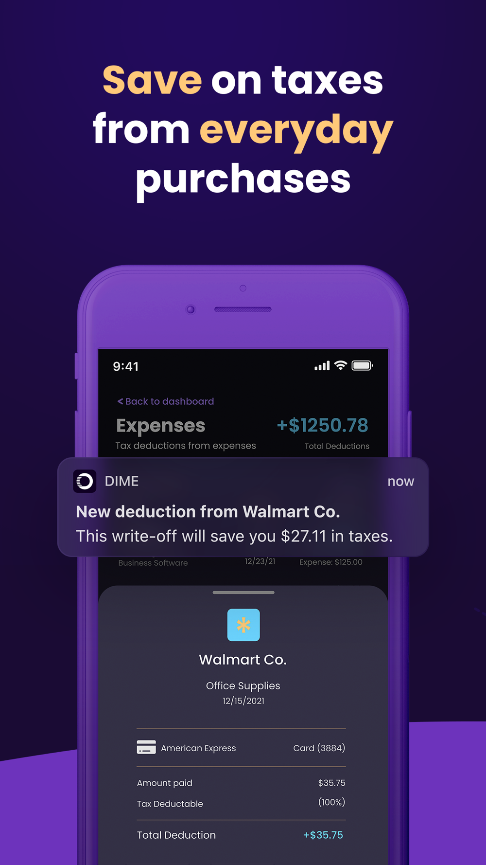 Don't let taxes and expenses become a headache - use Dime to take the stress out of your finances and help you keep more of what you earn.