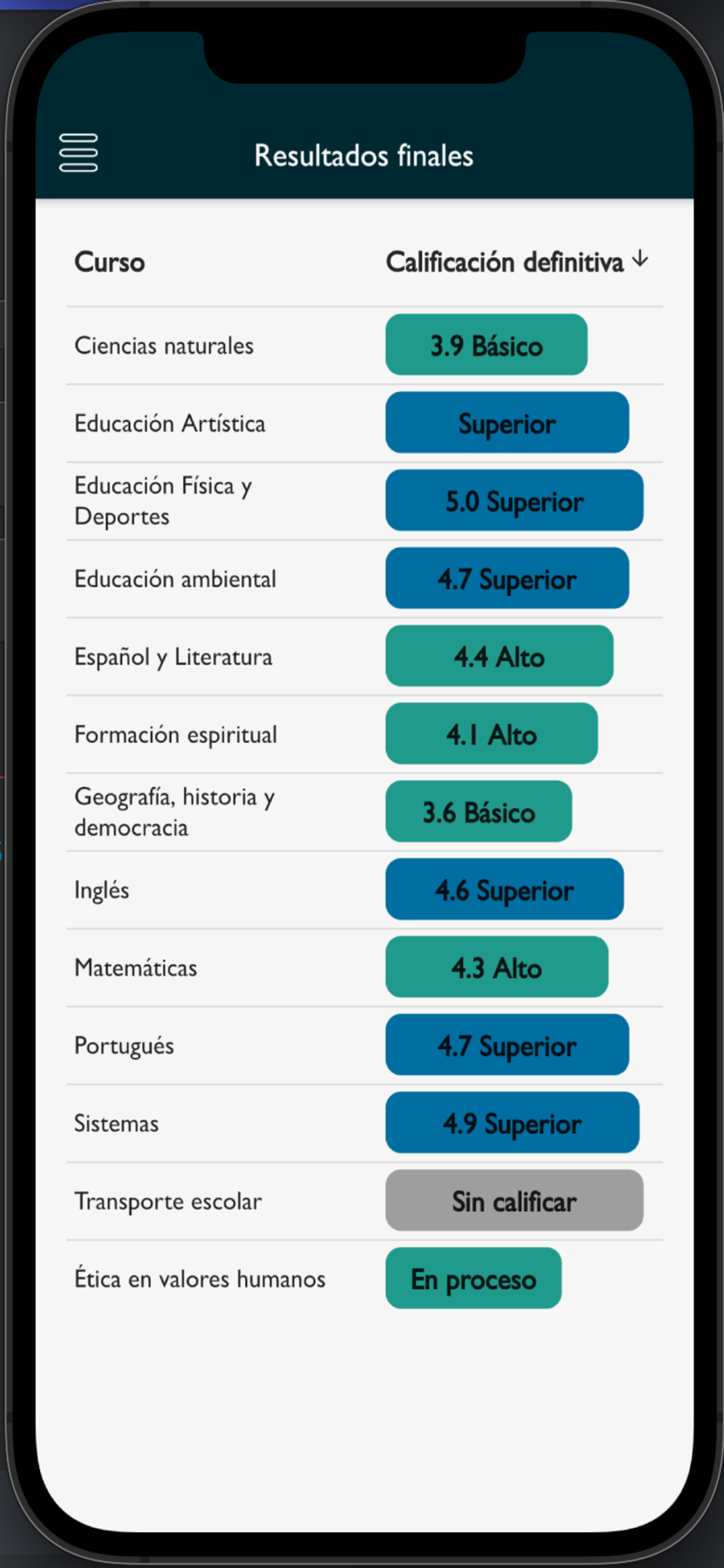 Utiliza los filtros para navegar entre años o periodos de evaluación y ver así todo tu historial académico.