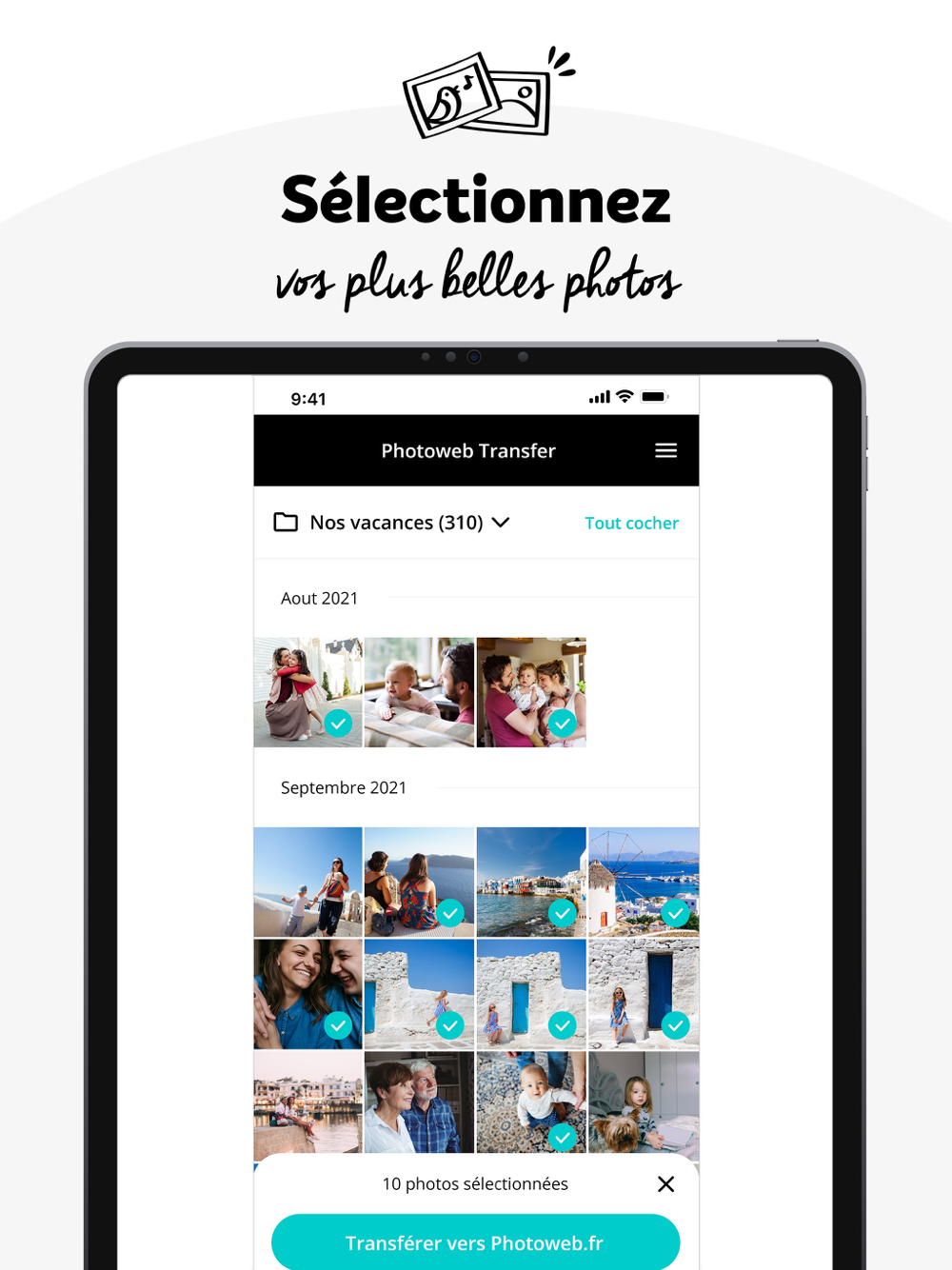 - Sélectionnez vos photo depuis votre téléphone, connectez-vous à votre compte Photoweb.fr et commencez le transfert !