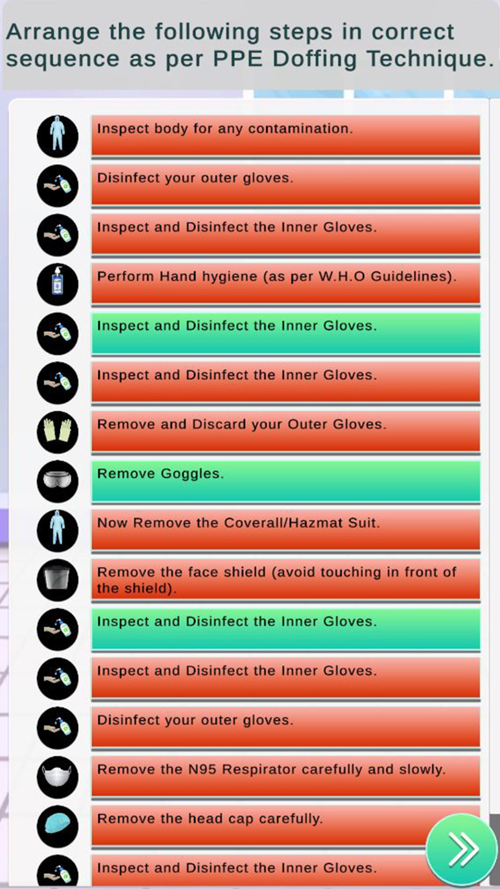 pick the correct item, likewise, the player learns the correct steps. After every step of donning, a questionnaire will follow, which will help the player memorize the steps easily.