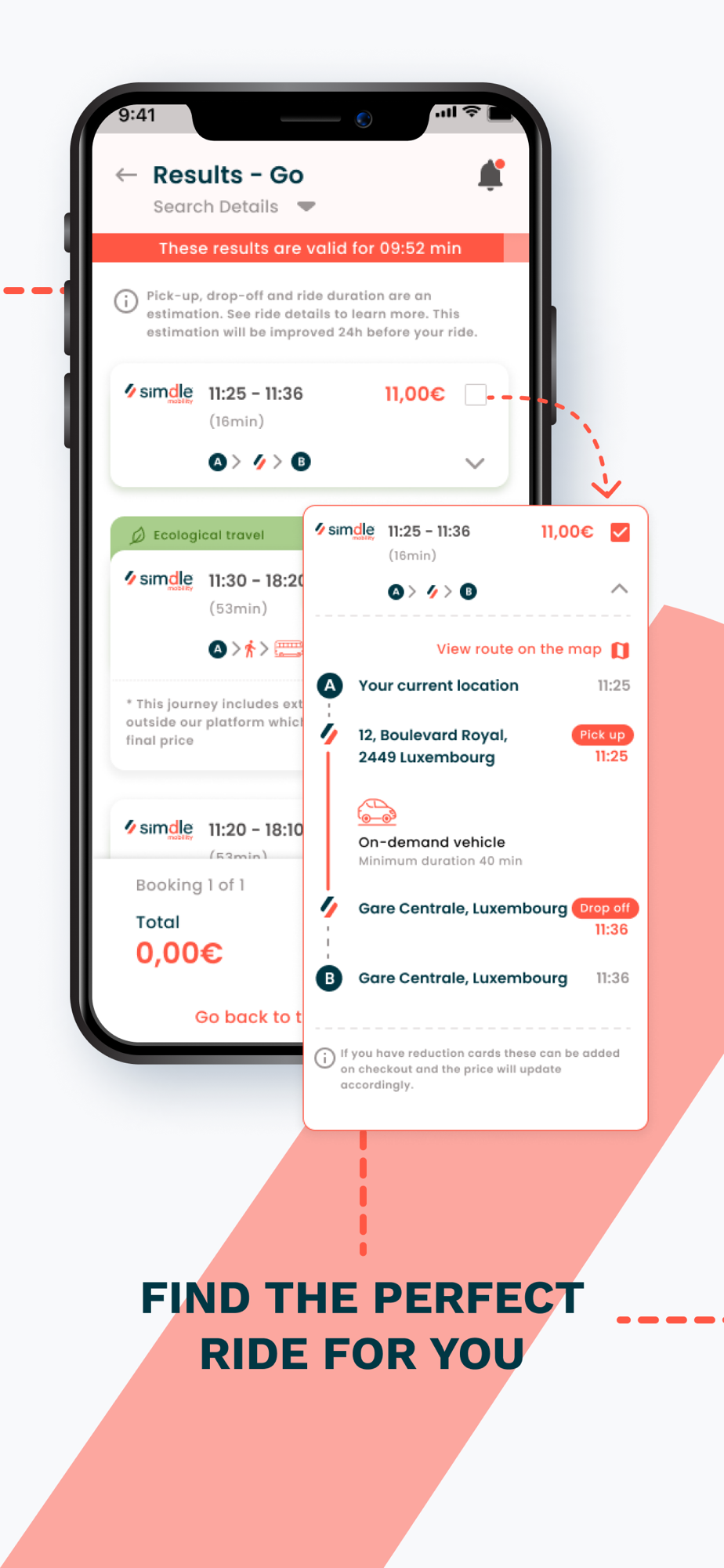 You can check previously booked or upcoming rides in the My Rides section, and view in detail the ride route and duration, as well as where you should be picked up and dropped off.