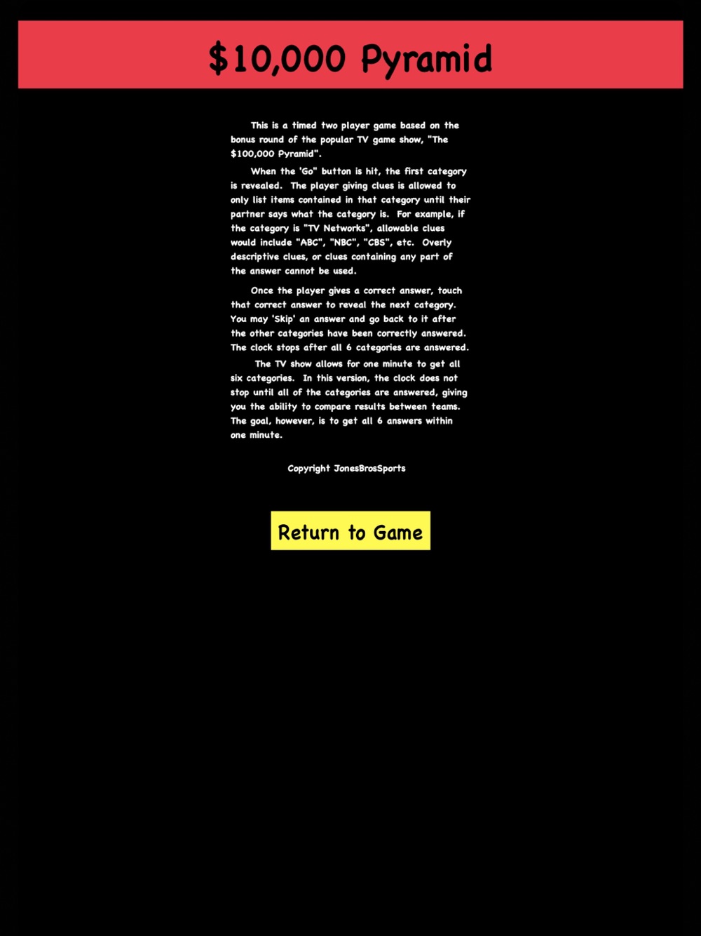 This is a timed two player game based on the Winners Circle Round of the popular TV game show, "The $100,000 Pyramid". One player lists items from each given category until the second player guesses the category. The objective is to guess all 6 categories in under a minute.