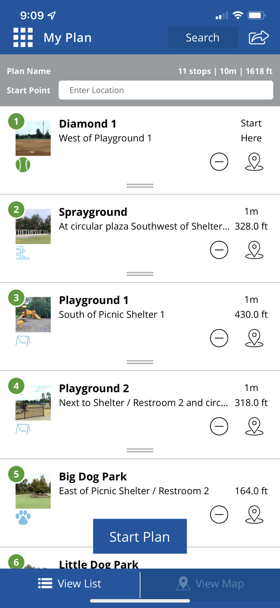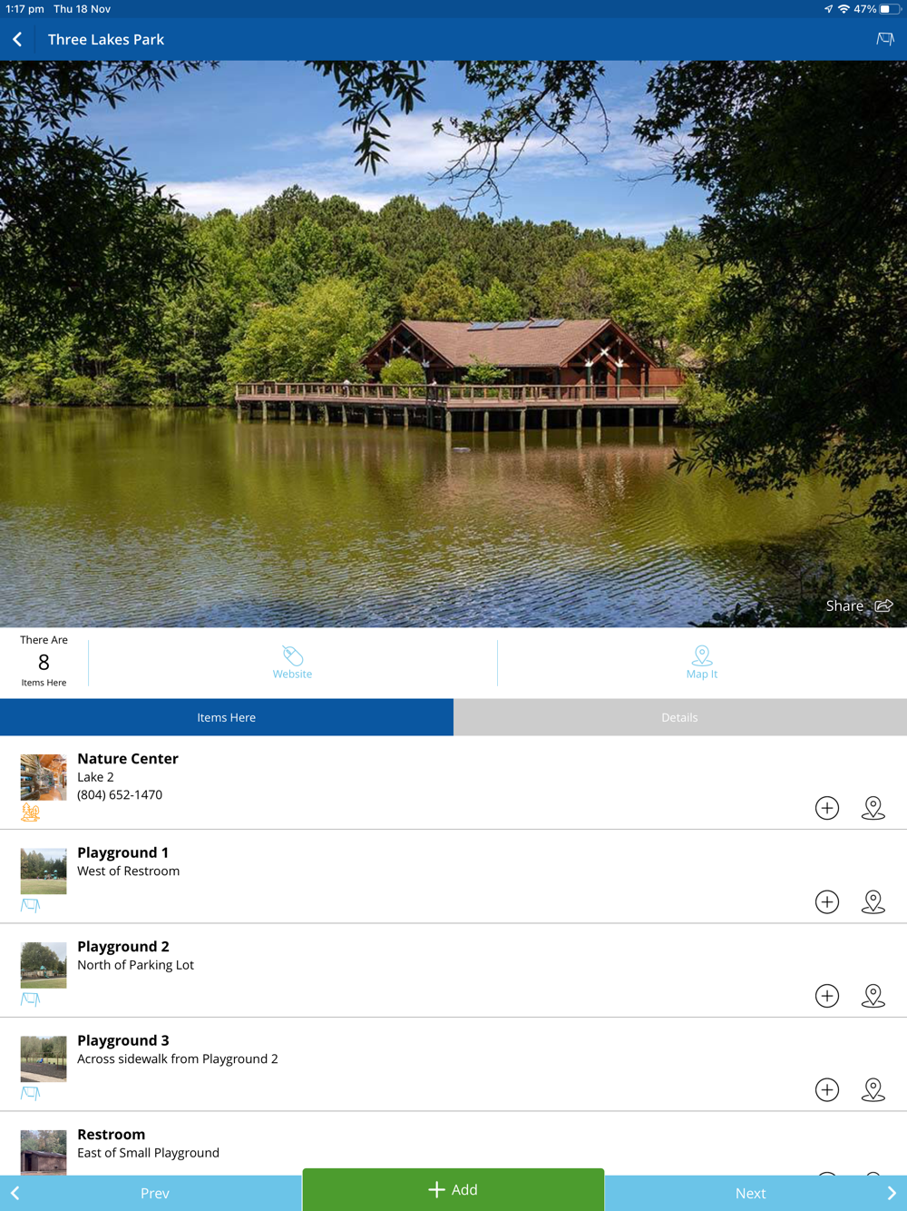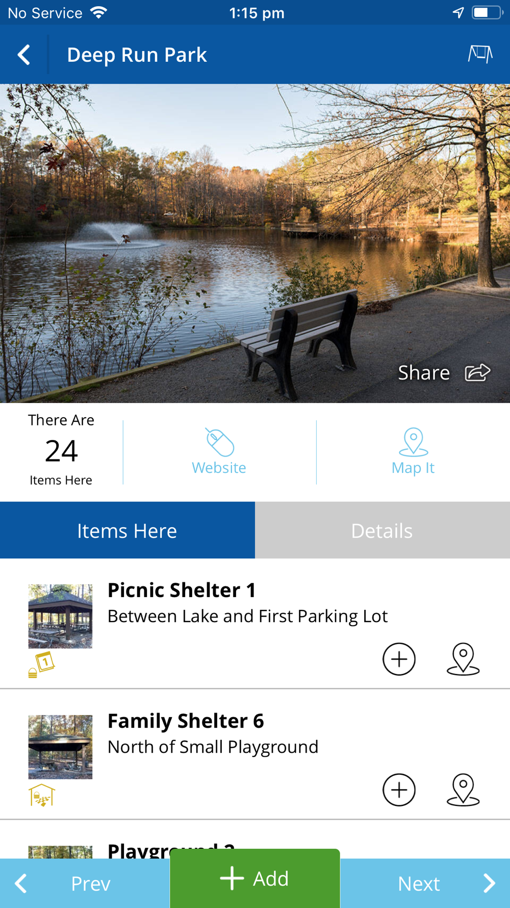 • Find playgrounds, shelters, trails, and more