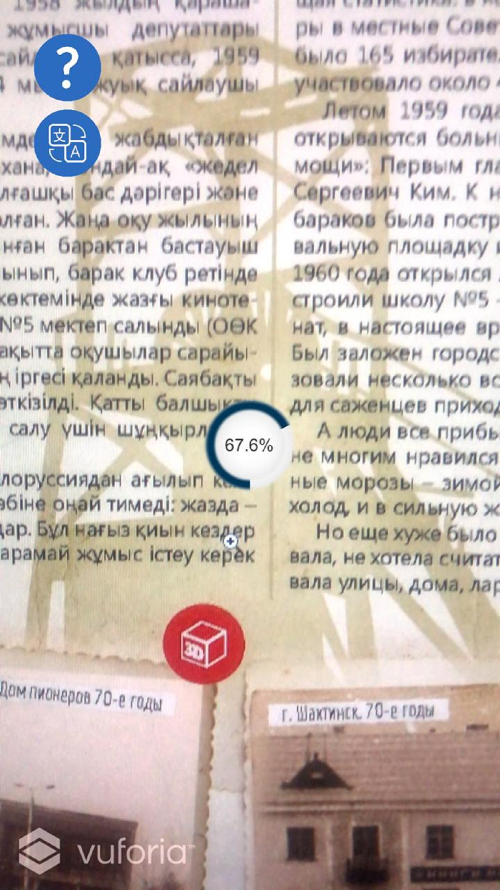 The mobile app with Augmented reality technology allows watching the video and 3D animation in the “Shakhtinsk is my favorite city” book. To watch the video download the mobile app and point the camera at the entire page of the book with the 3D icon. You will see a videо that you can watch while reading.