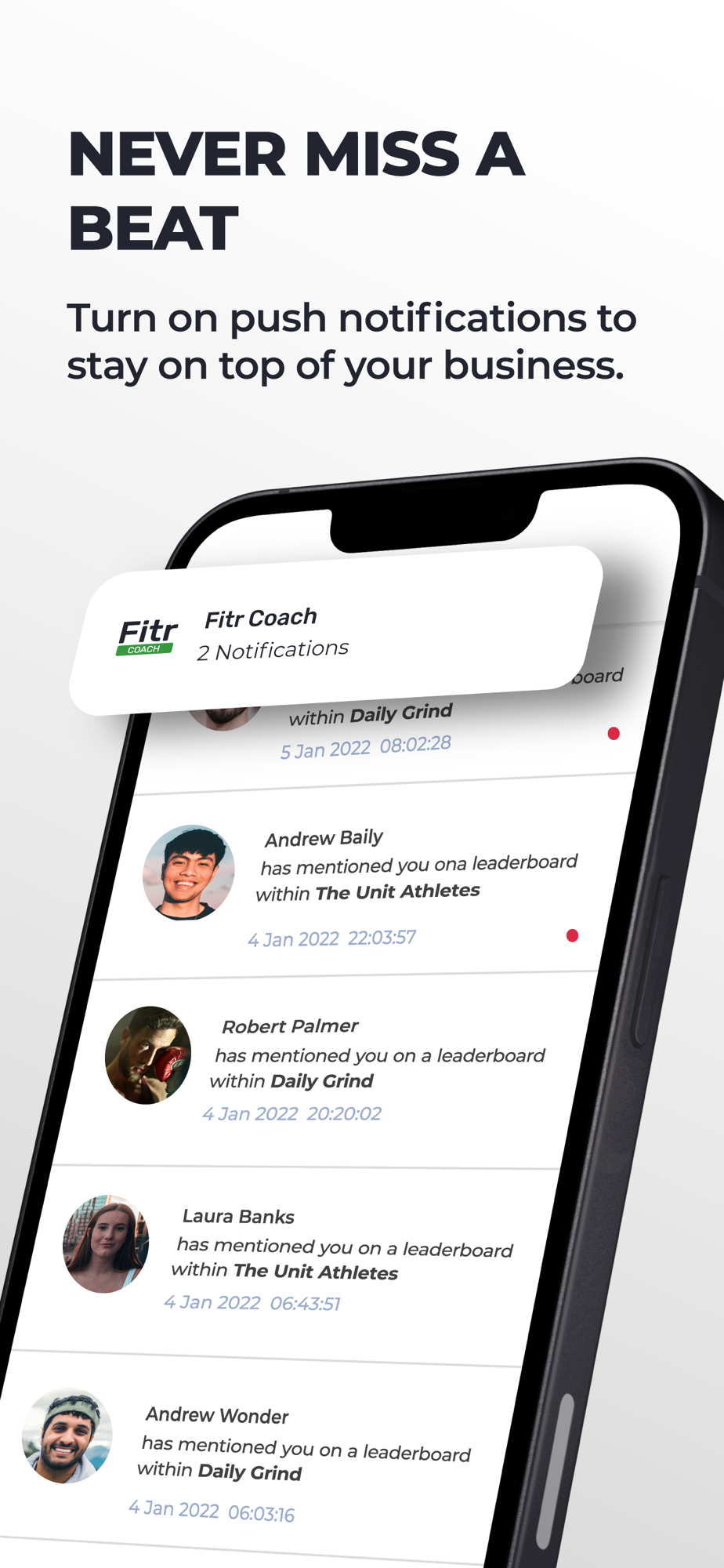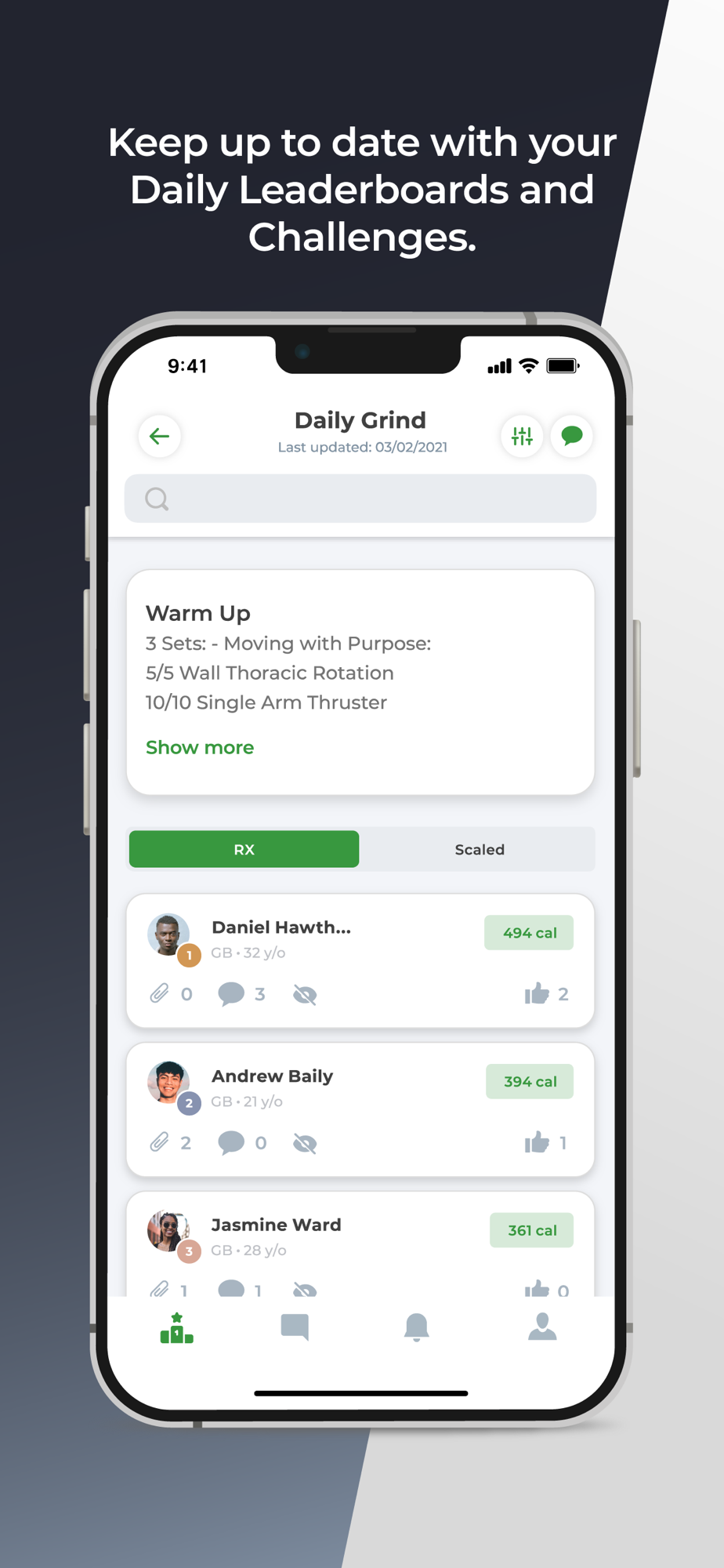 Manage your daily leaderboards and challenges on the move. Keep up to date in real-time as your clients post their results. View and comment on individual performances or message the entire leaderboard community to motivate your clients towards their goals.