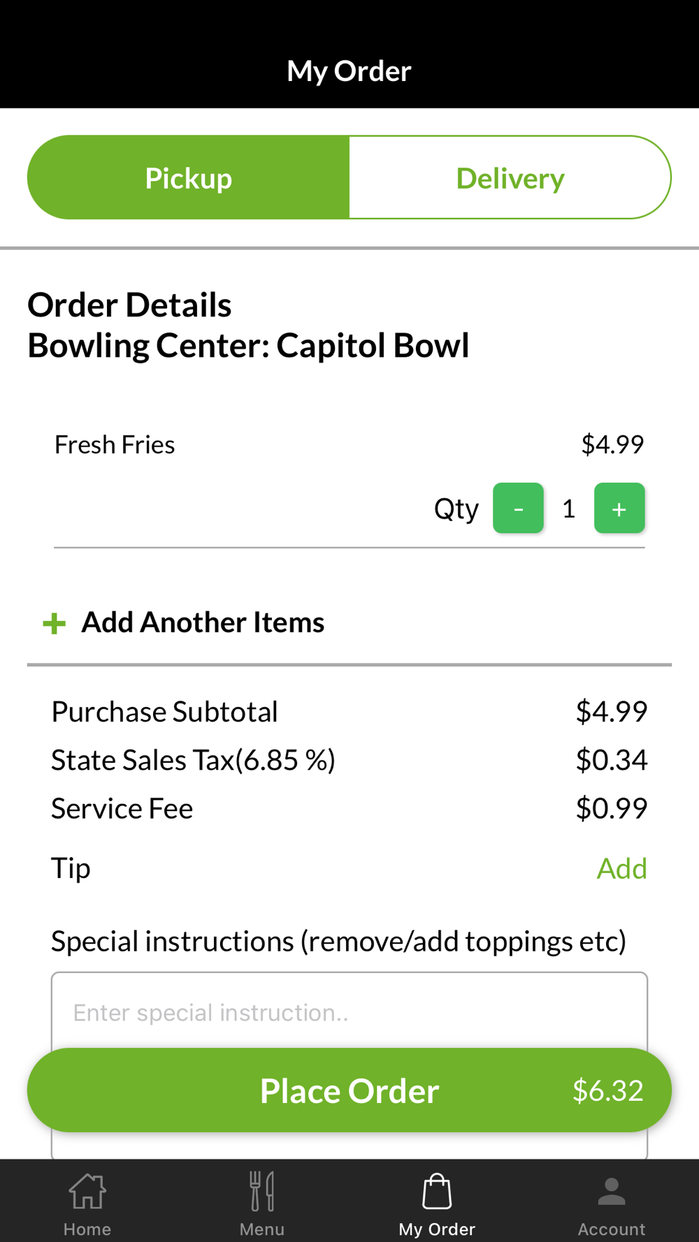 As a user, you can choose to have your order delivered to your lane or pick it up at the snack bar.