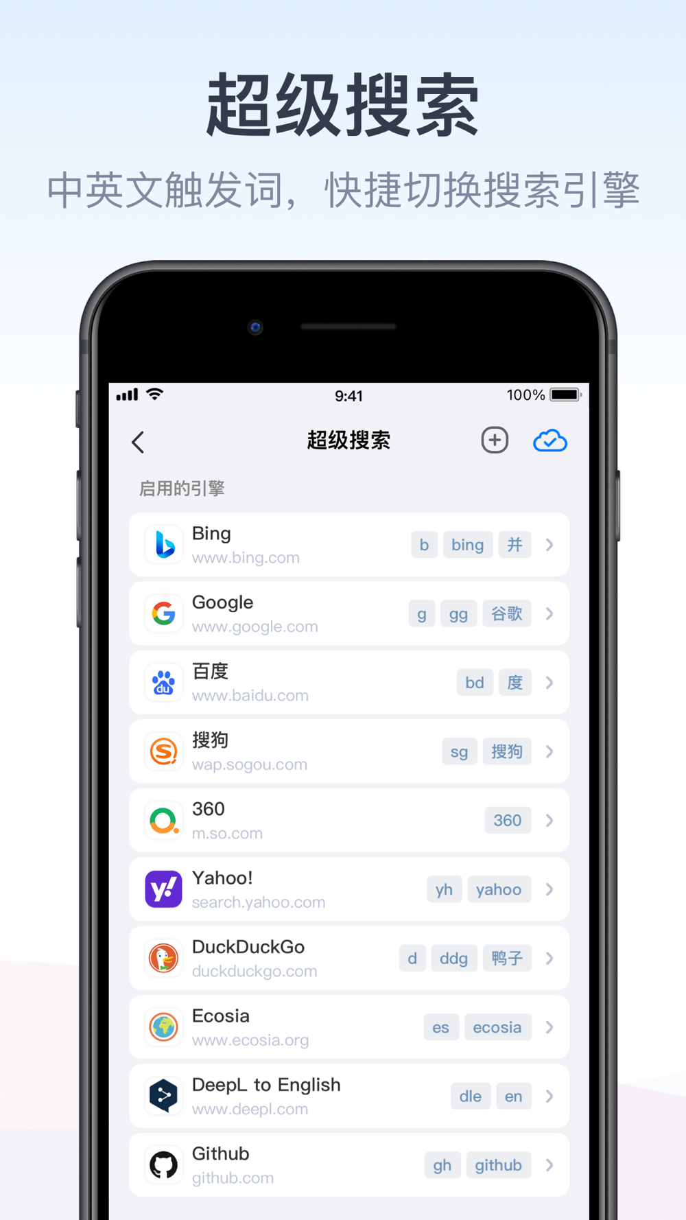 在Safari地址栏中输入「快捷触发词+空格+搜索关键词」,即可快速切换到设置的搜索引擎获得结果。