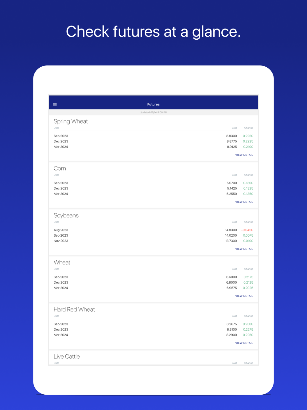 Futures: See Grains, Feed, Livestock, and Ethanol futures listed in order of your preference