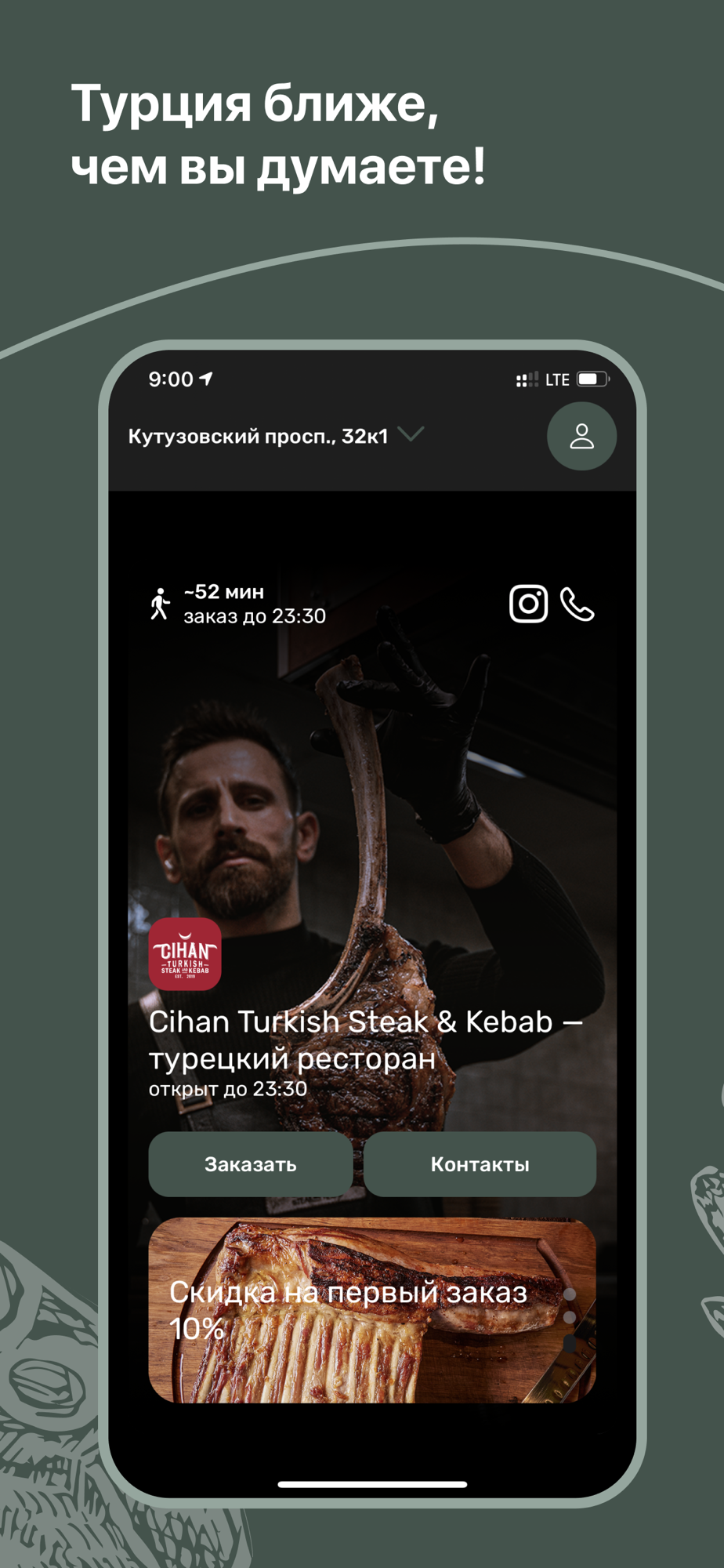 В нашем приложении вы можете оформить онлай заказ. В меню можно стейки от классических до альтернативных, и Wet Aged из собственного шкафа вызревания, неотъемлемые для турецкой кухни кефте из рубленого мяса, блюда на углях, мезе с невесомыми лепешками прямиком из тандыра и дюжину кебабов.