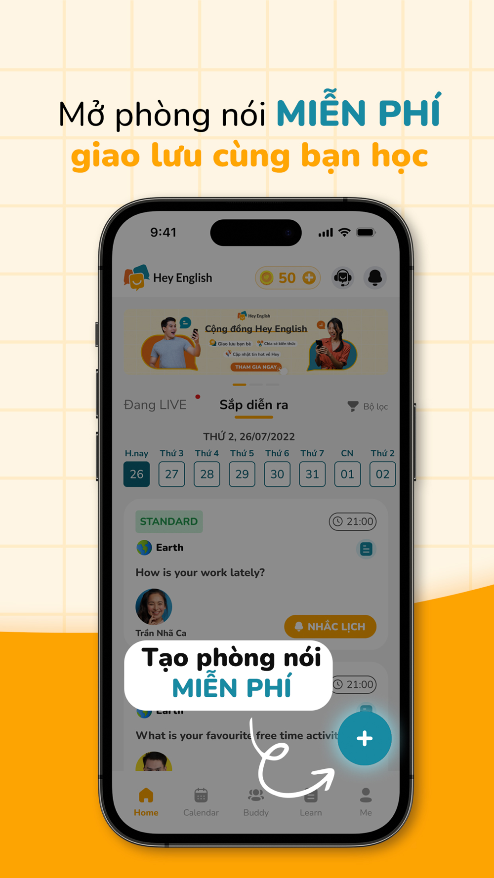 Ngoài các lớp học cần trả phí, Hey English luôn có các lớp học, Phòng nói miễn phí được trang bị sẵn phần ngữ pháp, từ vựng tiếng Anh theo chủ đề và câu trả lời mẫu. Bạn chỉ cần mở app học tiếng Anh Hey English là giao lưu được ngay!