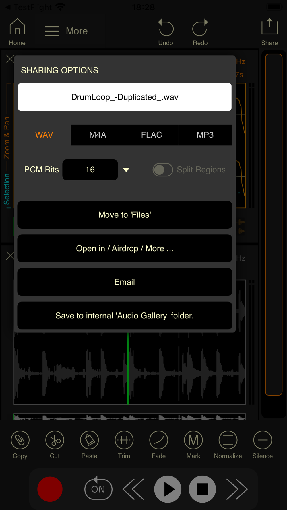 Export audio in .wav, .flac, .mp3 and .m4a formats.