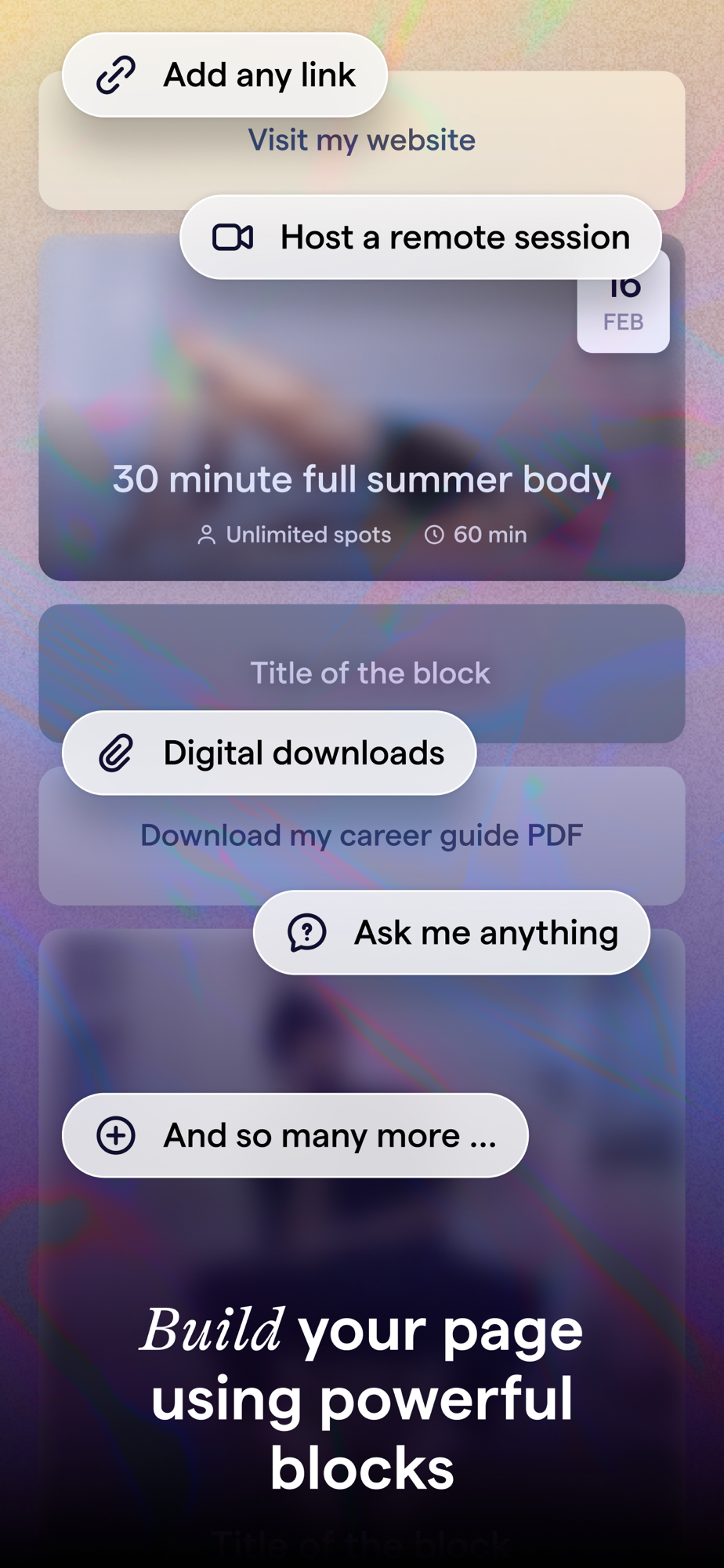 In your link-in-bio website, you can add links and collect money from your audience for unlocking access to your knowledge and passion through so called "blocks". At first, Flooz supports these blocks: