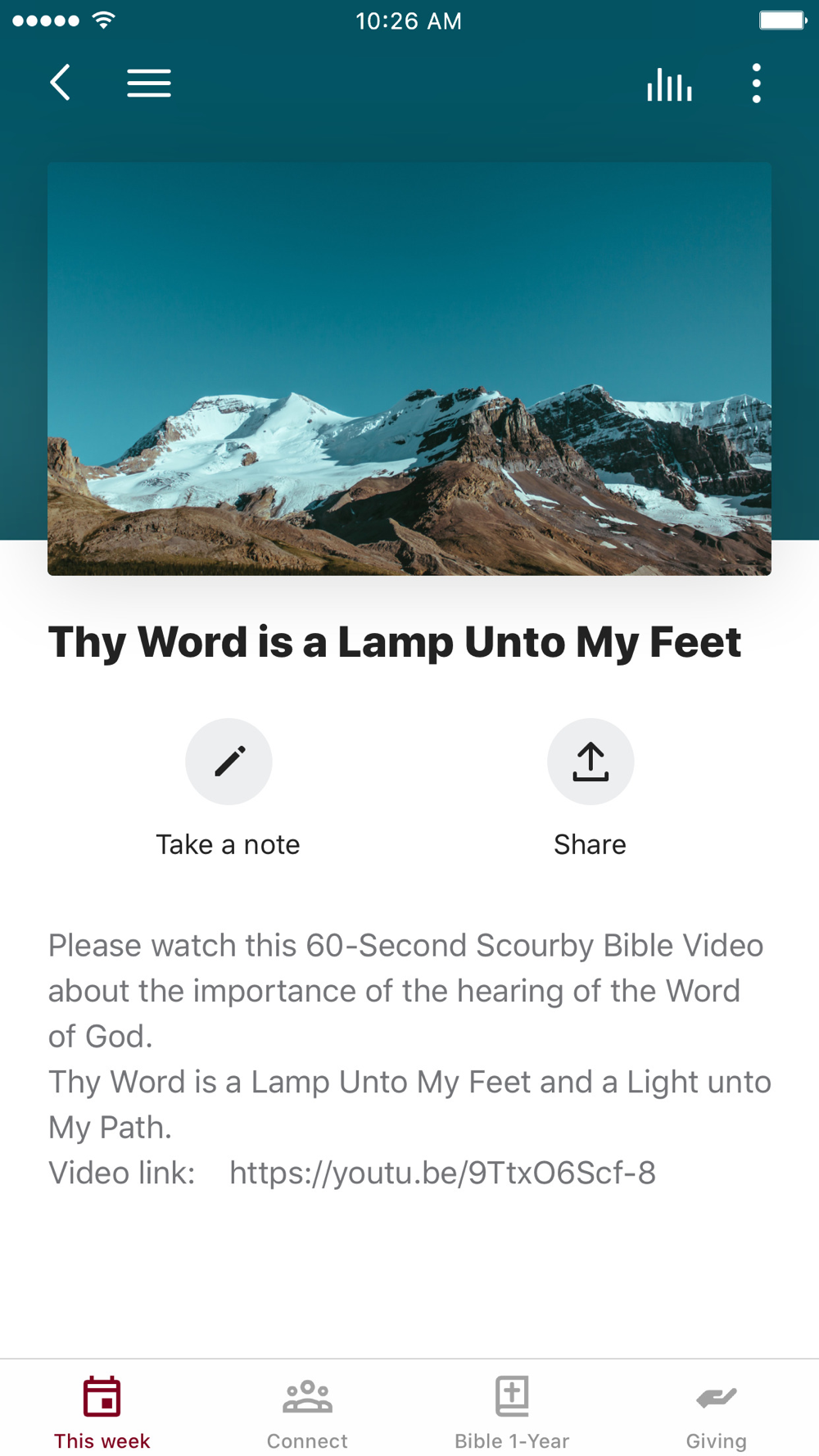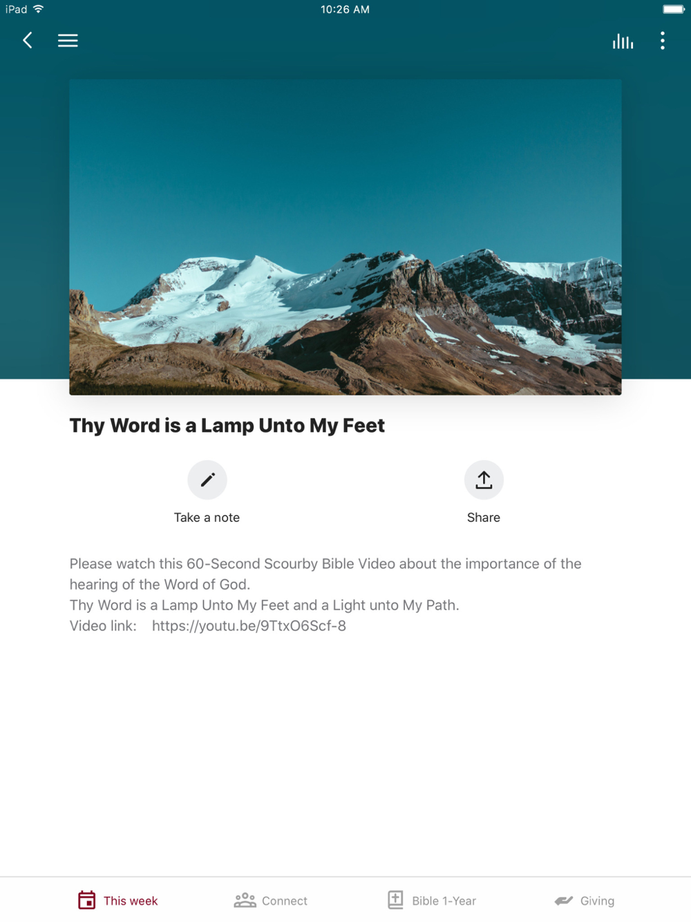 This app will help you stay connected with the day-to-day life of our church. With this app you can: watch or listen to past messages; stay up to date with push notifications; share your favorite messages via Twitter, Facebook, or email; and download messages for offline listening.