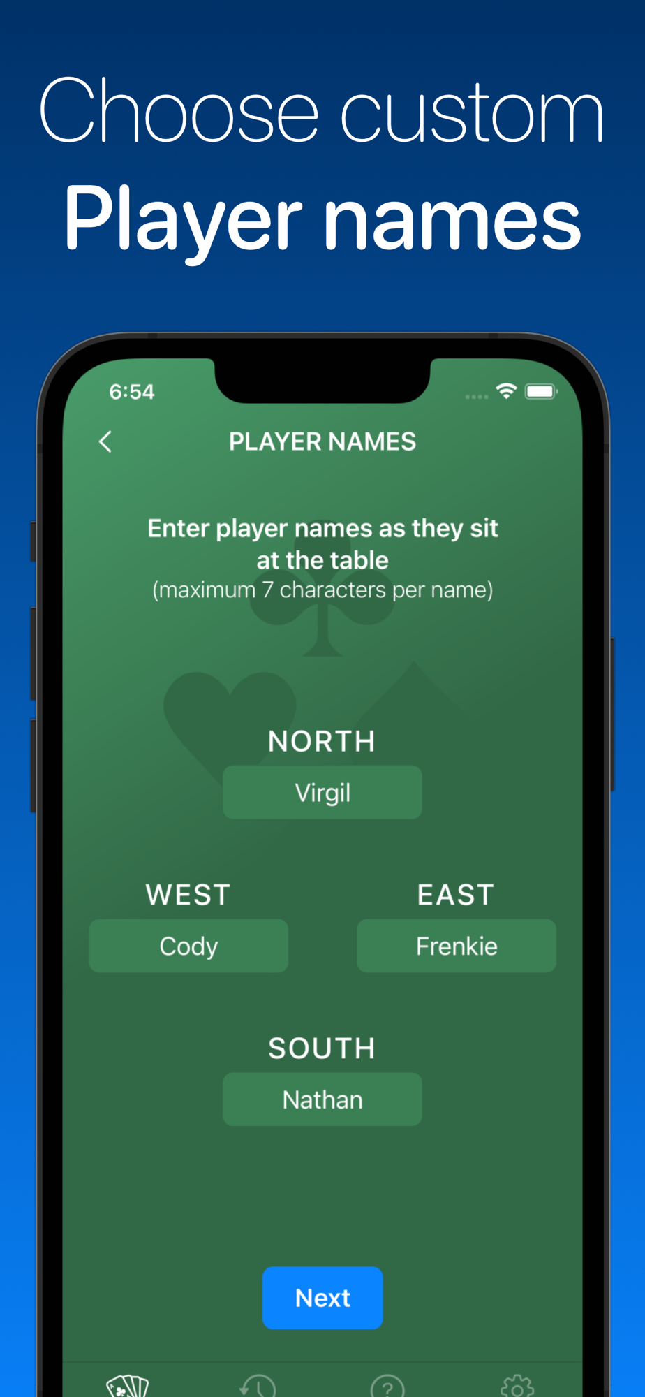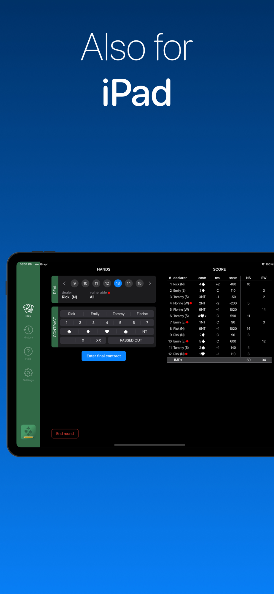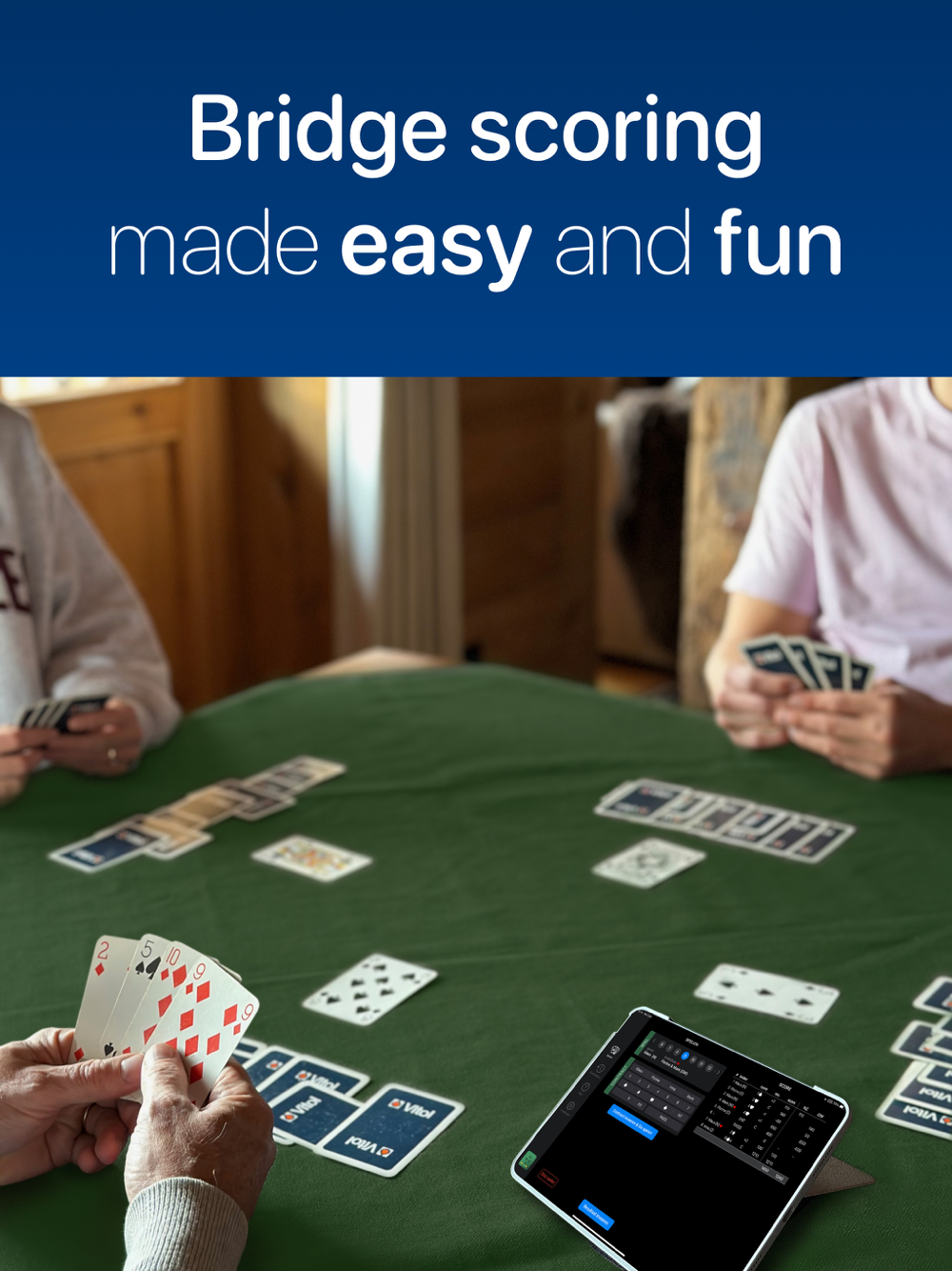 This app for iPhone and iPad calculates all scoring (contract bridge or IMPs) for social bridge played with four. Easy and intuitive! Many extras: statistics, save played rounds and share results.
