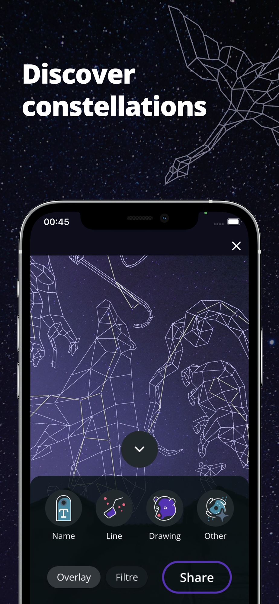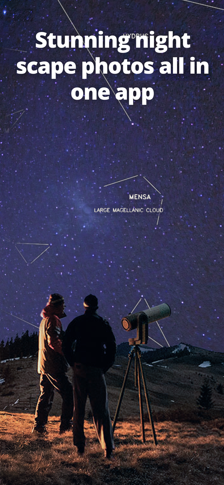 Using Unistellar's proprietary image processing algorithms, Nocturne brings to life your night scape photographies, allowing you to capture your scene under a showstopping starry sky, at the press of a button. Simply stabilize your iPhone (using a tripod or resting it on a solid surface) and start the capture. The app will generate and stack images to bring out all visible stars on the final photo.