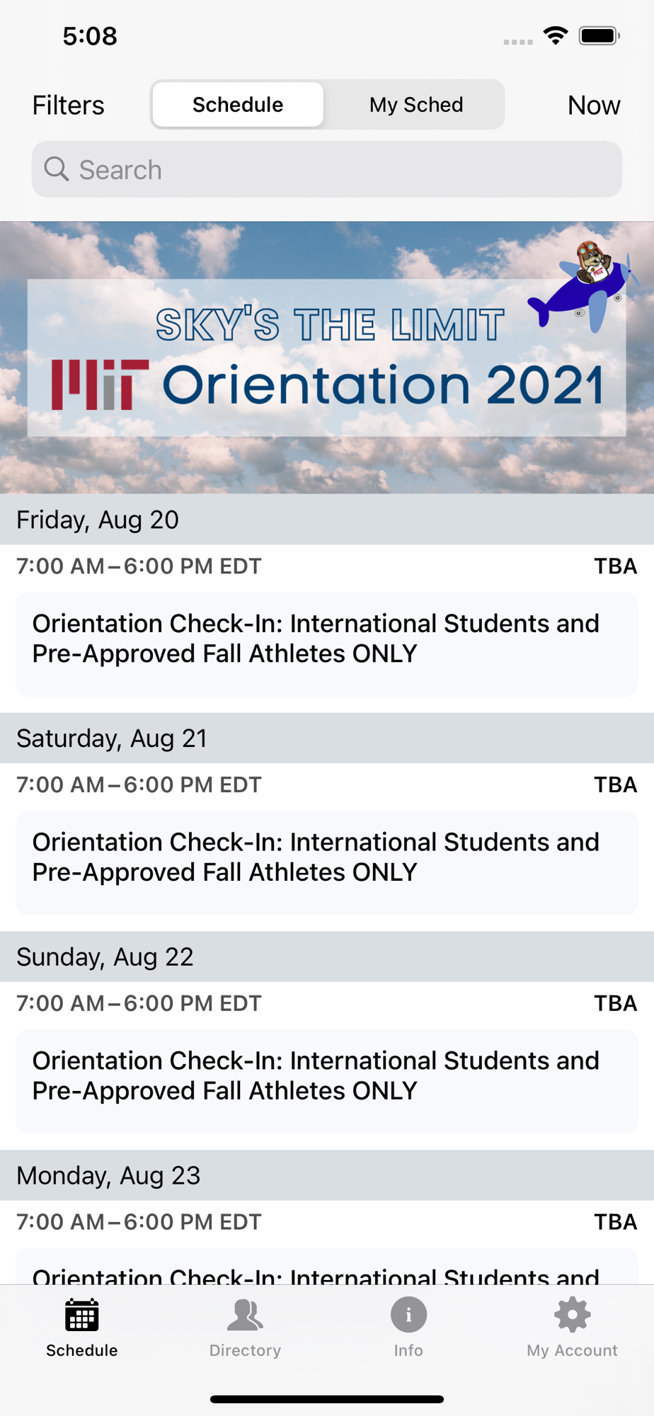 Conveniently browse the entire schedule for MIT Orientation 2021. Get the key information of your event without ever having to crack open an event guide.