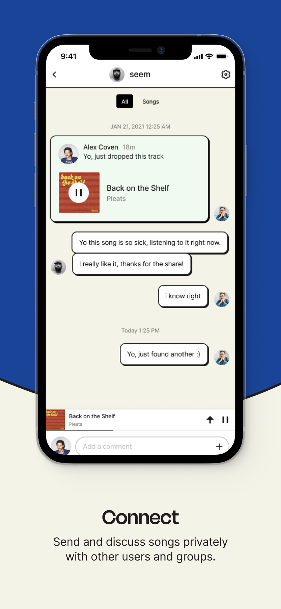 Connect - Send and discuss songs privately with other users and groups