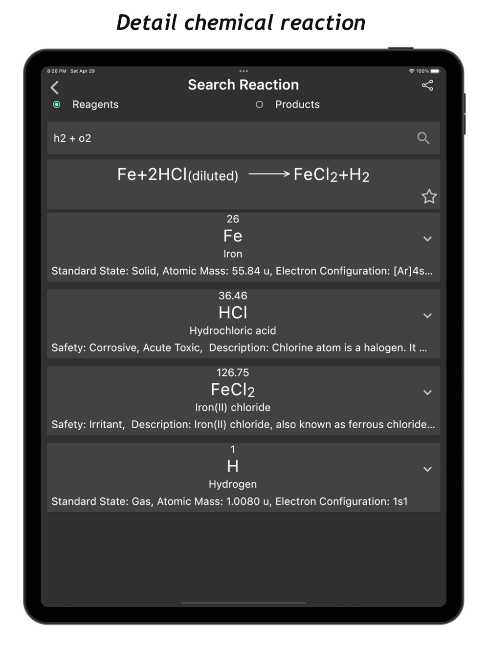 +  In each reaction, your will get the detail of compound and element of reaction like formula, IUPACName, safeties, molecular weight, the reaction condition  ...
