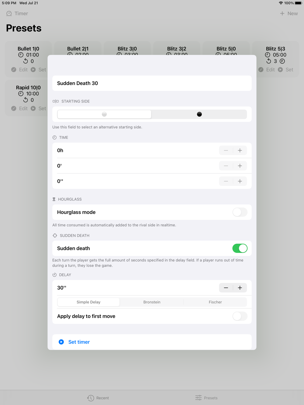 - Presets: Special pre-configured timers for standard Blitz, Rapid and classic games.