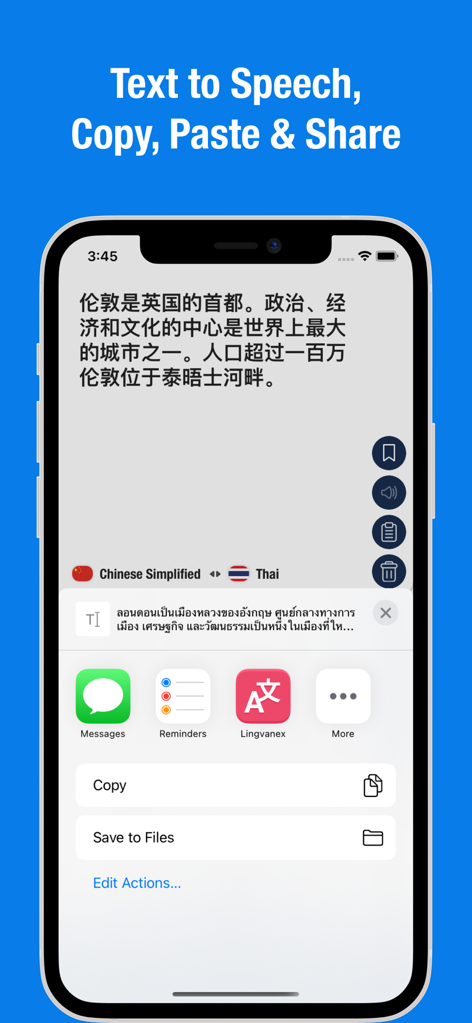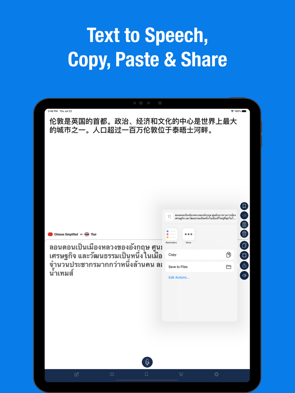 It is a translation tool that helps you break down language barriers. Excellent app for all who make the first steps in learning Thai or Chinese languages. Intuitive interface, easy navigation, quick result. Begin conversations confidently!