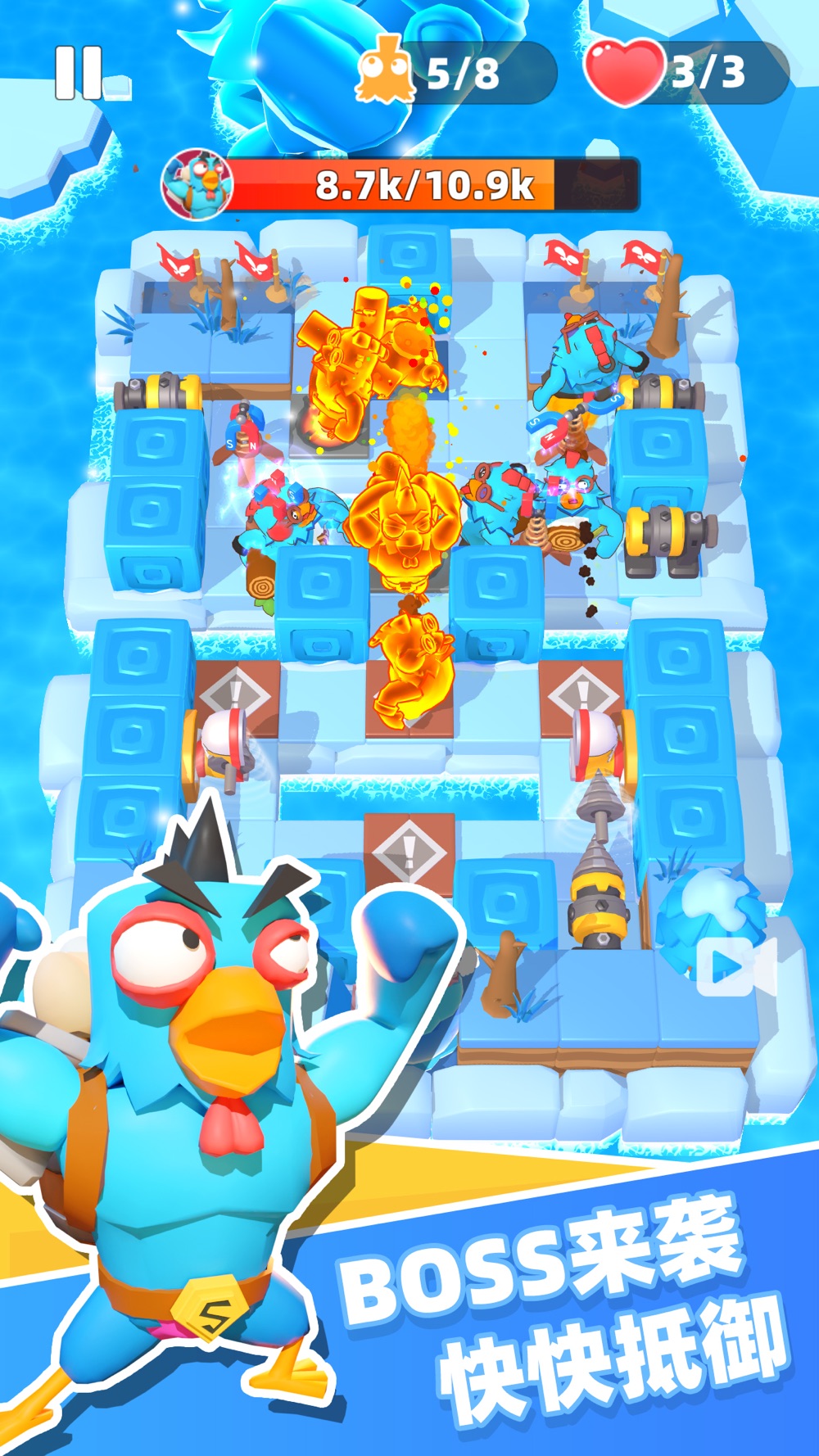 草原上的弱鸡、盾鸡,雪地上的大胖鸡等等,随着地图的解锁会出现更多不同类型的小鸡来挑战你的陷阱布局!