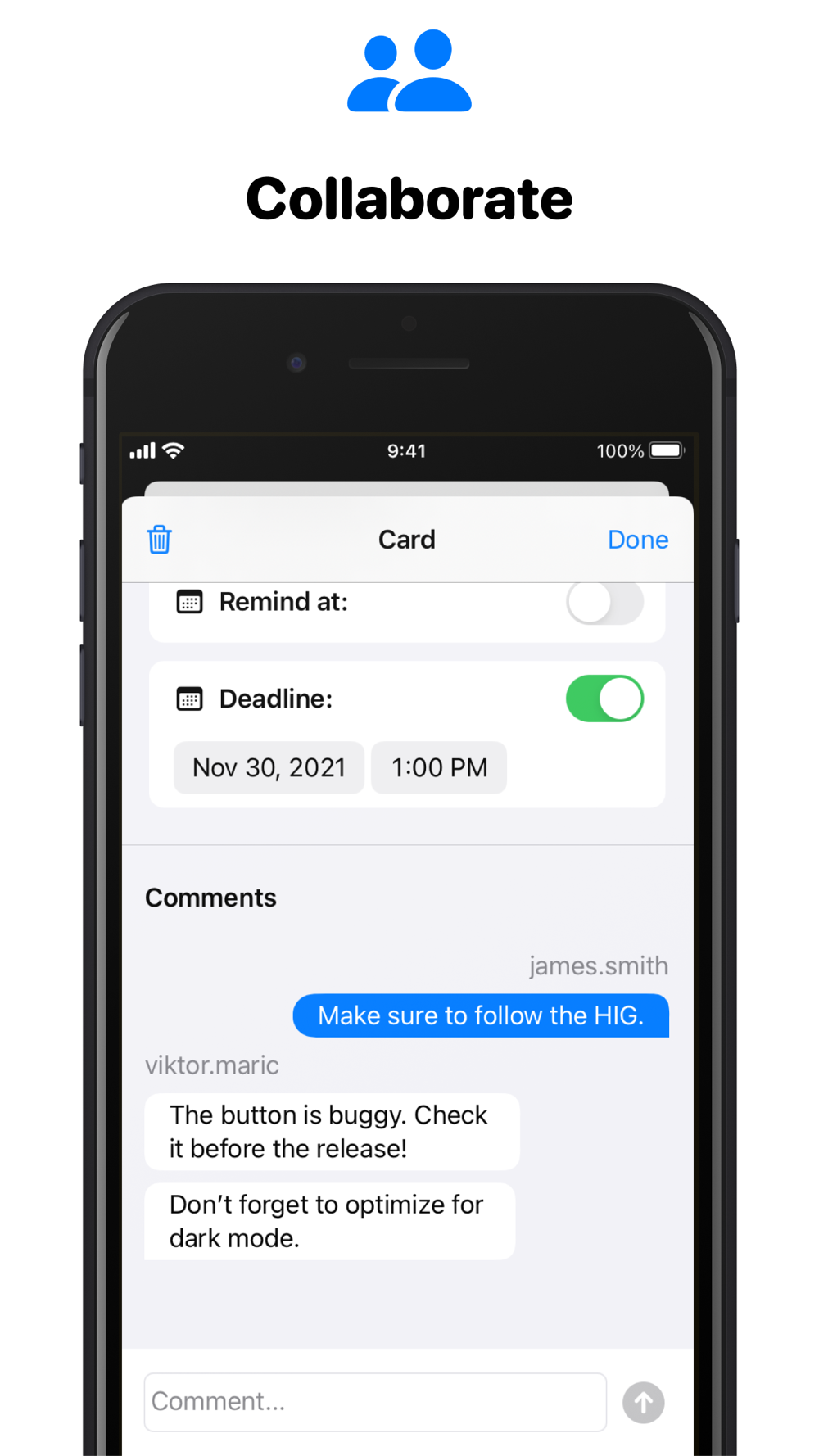 - Reminder & deadline: Assign deadlines and reminders to tasks to never forget them.