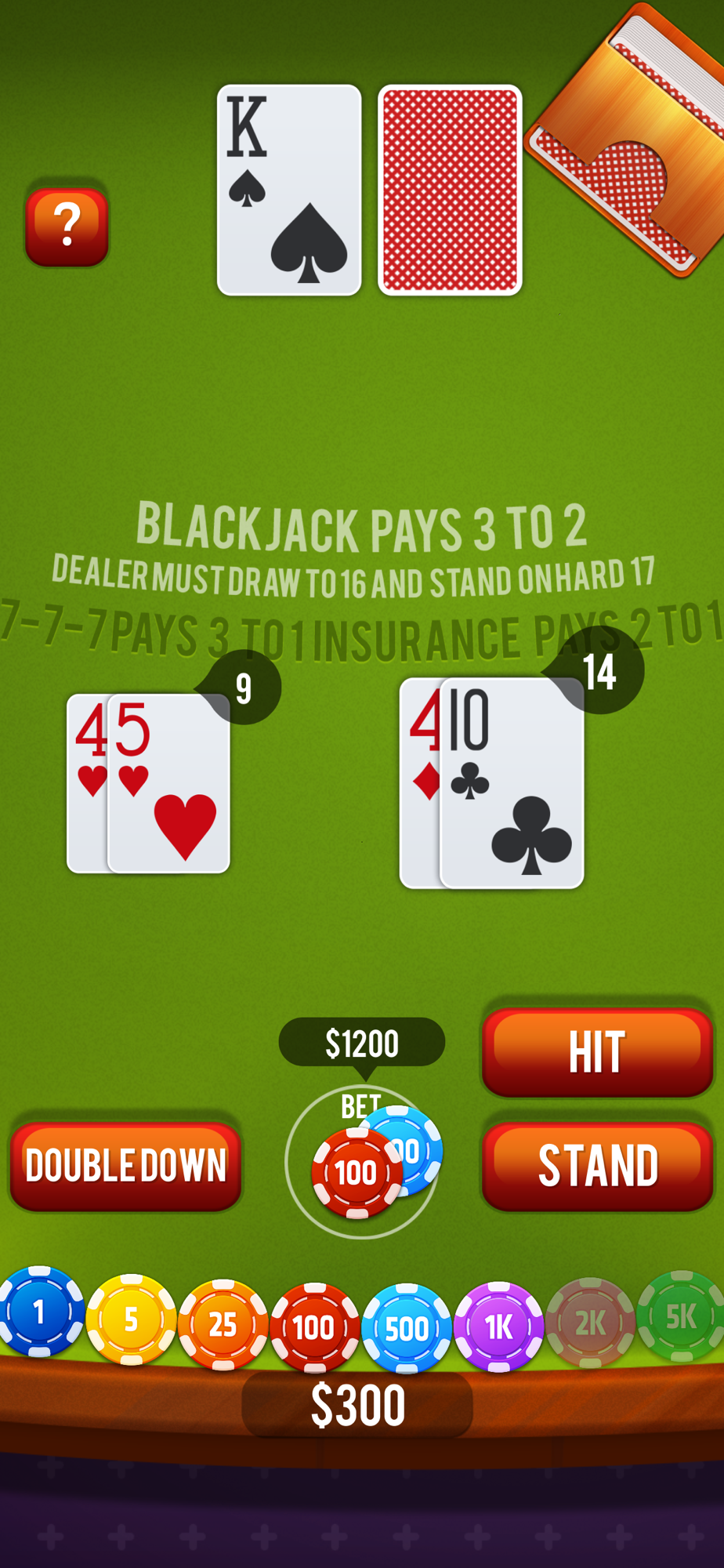 Blackjack is easy to play! Tap the chips to adjust your bet. Get your cards to have a total points greater than the casino, but without going over 21 to win money in the form of chips or other interesting prizes.