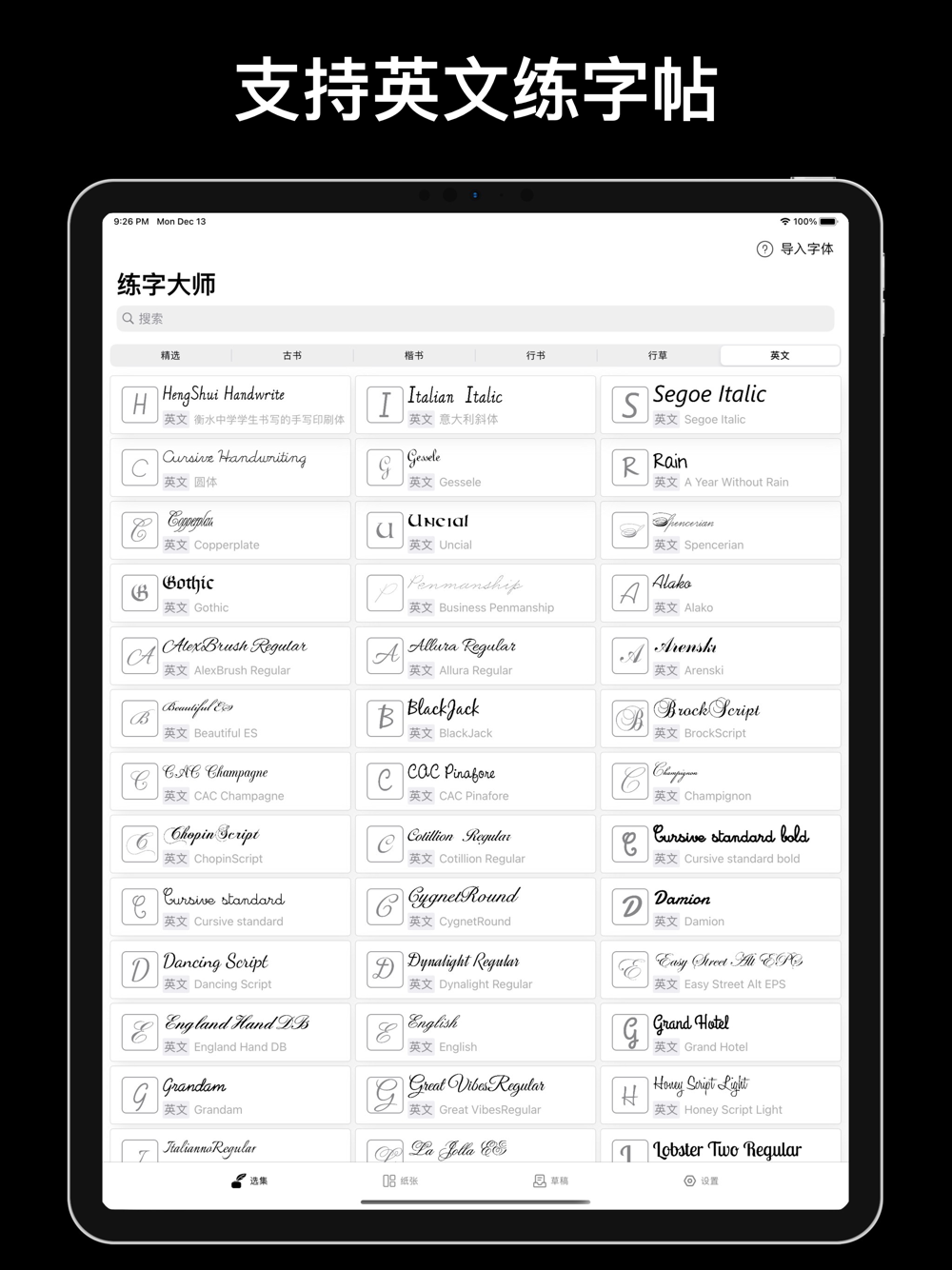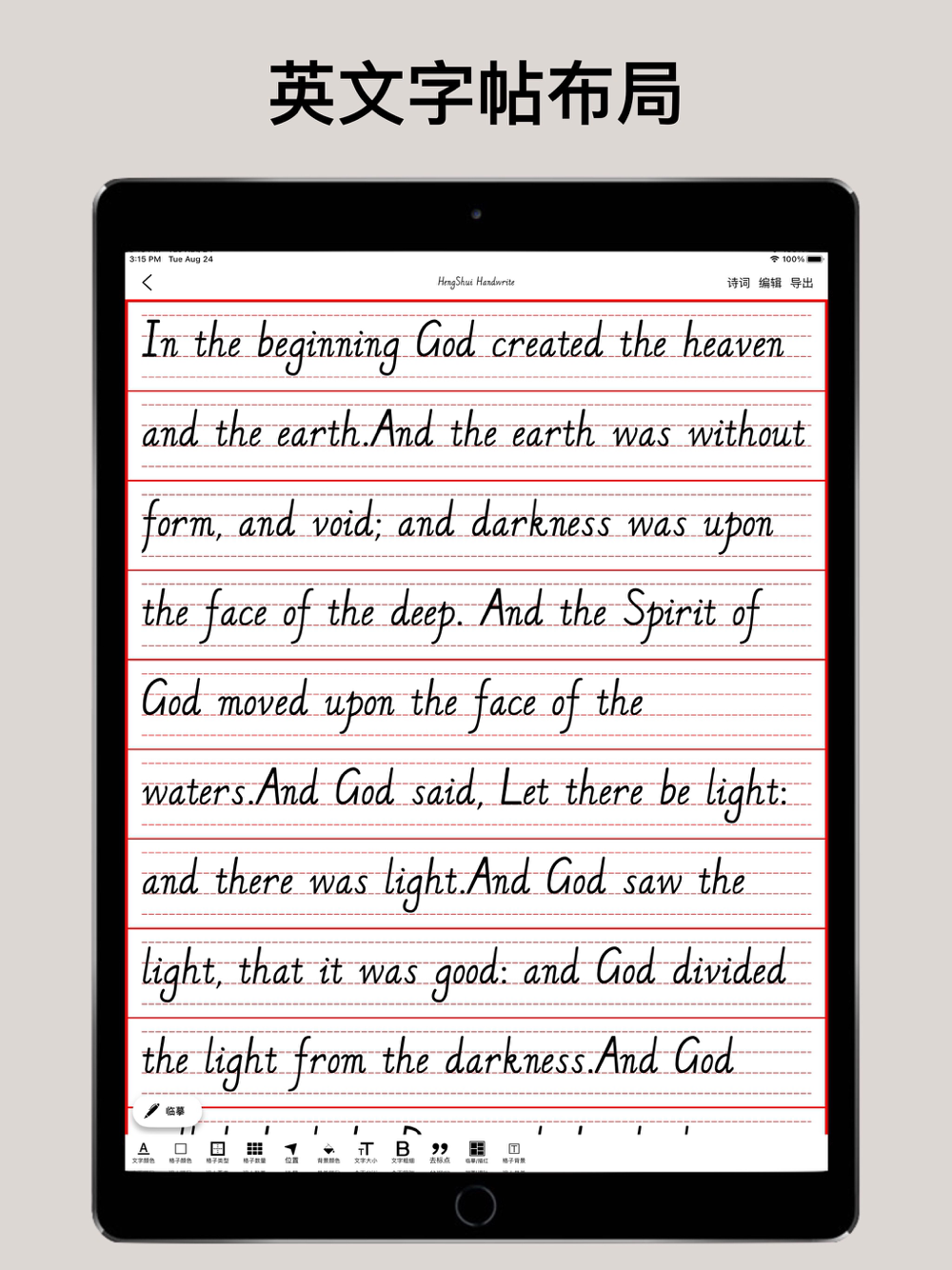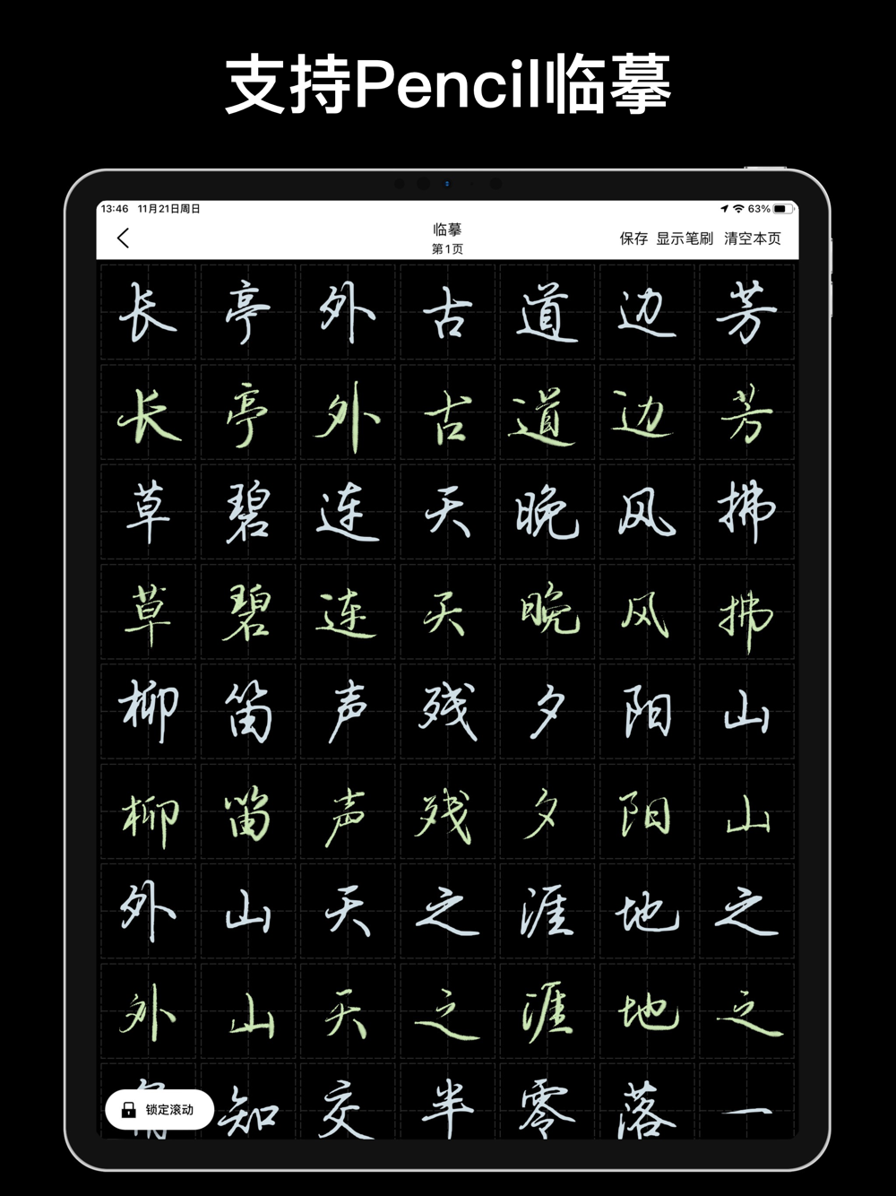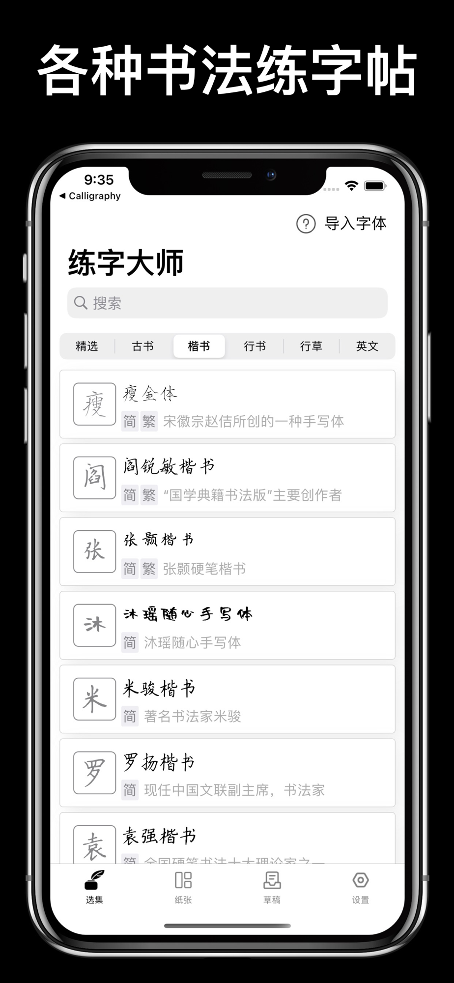 练字大师是通过iPhone或iPad自动生成电子字帖并支持导出打印的工具,让你告别购买纸质字帖,实现字帖自由。练字大师支持中文、英文、韩文、日文等多种语言的字帖生成,同时支持楷书、行书、草书、瘦金体、大篆、小篆、隶书等多种书法字帖。同时练字大师完美支持iPad上Pencil临摹描红。再也不用为书法练字帖发愁了。