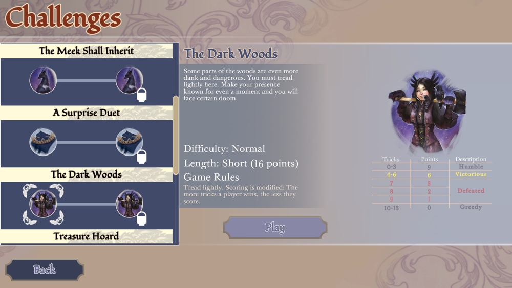 A trick-taking game for 2 players, each playing cards to win tricks against the other over multiple rounds. Players score points during a round depending on how many tricks they end of taking at the end of the round. Most points at the end wins.
