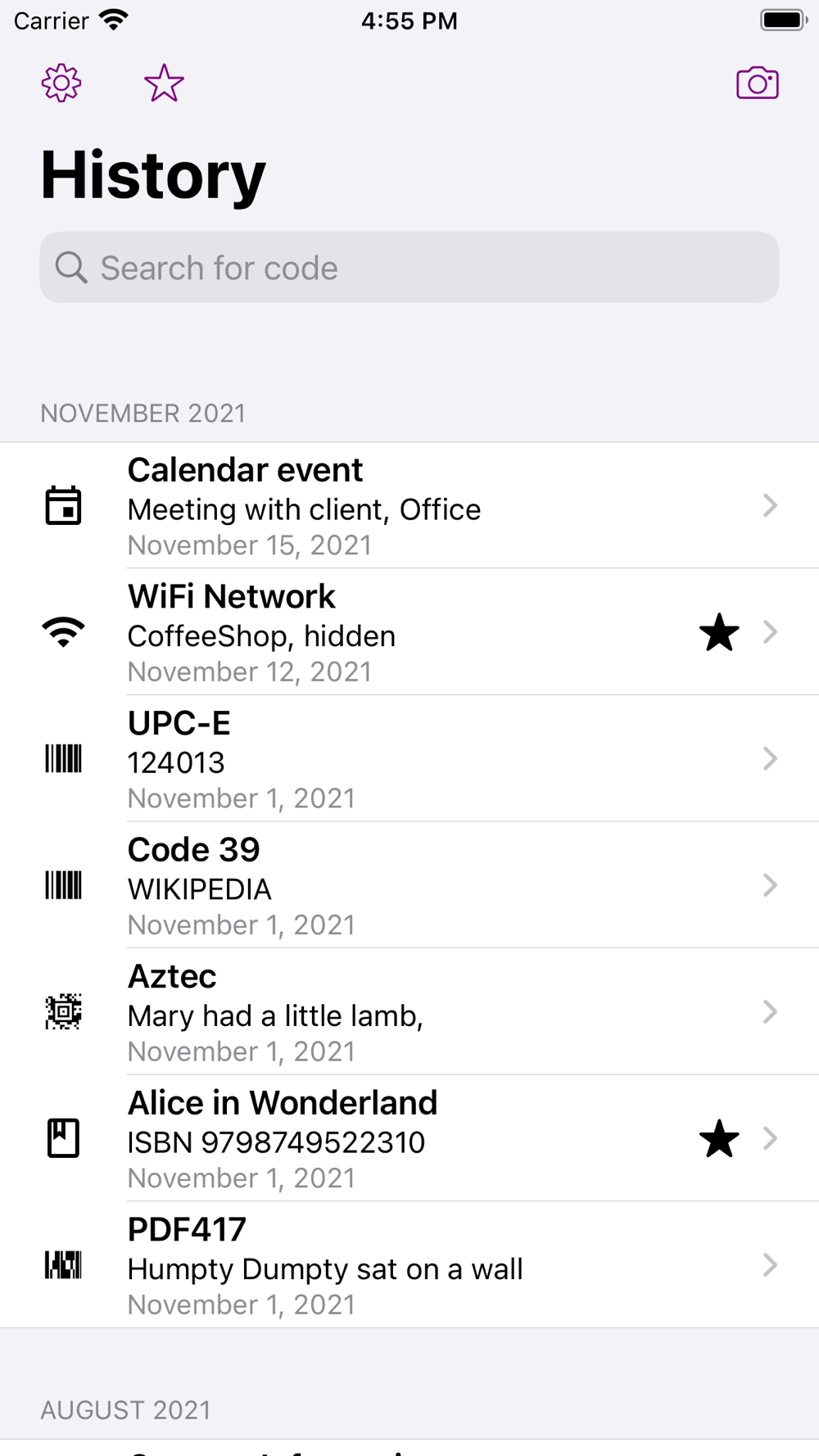 - scan 2D codes like QR, Aztec, Data Matrix, PDF417